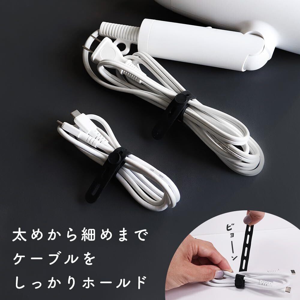 調整可能でとっても便利:4つ穴なので、ケーブルの太さに合わせて調整が可能です。 細いケーブルから太いケーブルまでしっかりと固定できます。 すべすべしっとりとした優しい質感なので、 ボタンのように留められれ、一般的な面ファスナー製のようにバンド同士がくっついたり、 ゴミが絡みつくこともありません。