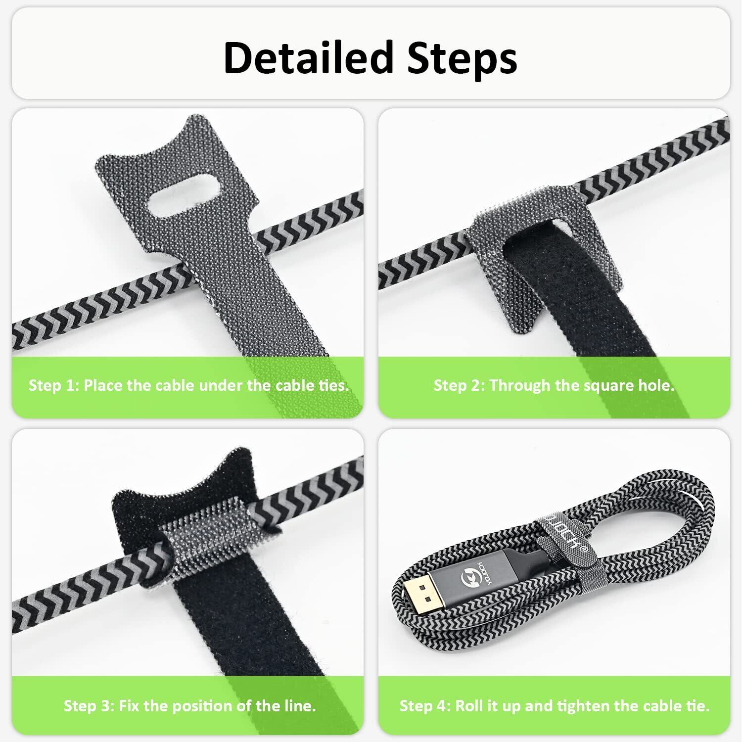 【使用簡単】ケーブルまとめ:ケーブルをまとめた後、結束バンドの穴を通し、ケーブルの真ん中を何回も巻き付けて貼ります。 結束バンドの長さが足りない場合は、何本のを繋げてご利用になれます。