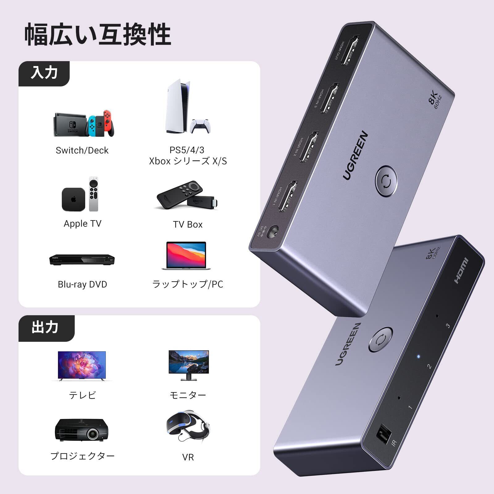 【2025最新】UGREEN HDMI 切り替え器 3入力1出力 8K@60Hz/4K@120Hz HDMIセレクター HDMI切替器リモコン付き48Gbps HDMI2.1 HDCP 2.3 【PS3/PS4/PS5/Switch対応/動作確認済み】