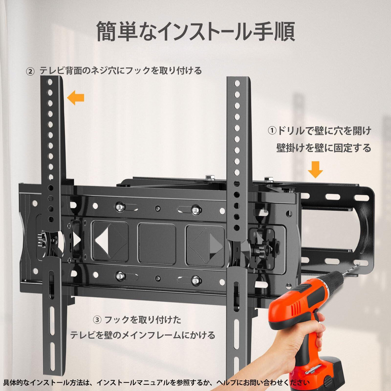 取付迅速&簡単 - 必要な部品(ネジ、水準器、)は全て揃っており、分かりやすい日本語取扱説明書も付属されます。初心者でも数分以内にすばやく簡単に取り付けできます。1、壁にプレートをネジ止めします。2、ブラケットを取り付けたテレビをプレートにひっかけます。3、テレビ壁掛け金具をお好みの角度に調節します。組み立てについて、何かご問題、ご不明な点がございましたら、ぜひ、ご遠慮なく、こちらに連絡してください。このテレビ壁掛け金具には、取り付けに役立つすべての必要な備品、ツール、および詳細なグラフィックの説明が付属しています。