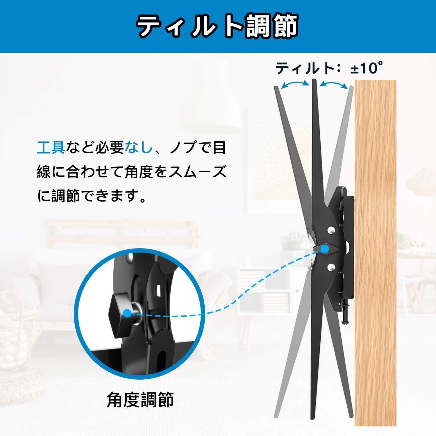 【角度が自由で見やすい】ネジ止め式で角度調節ではなく、ノブで簡単にティルト調節タイプです。テレビは上向き10度、下向き10度で角度を変わる可能です。視聴場所に合わせてスタイルを自由自在に、楽々テレビが楽しめます。壁からテレビ背面の距離はわずか50mmの薄型 tv壁掛け金具で、金具が目立ちにくく、美しい仕上げを実現します。※テレビのサイズにより角度調節範囲は変化する場合があります。