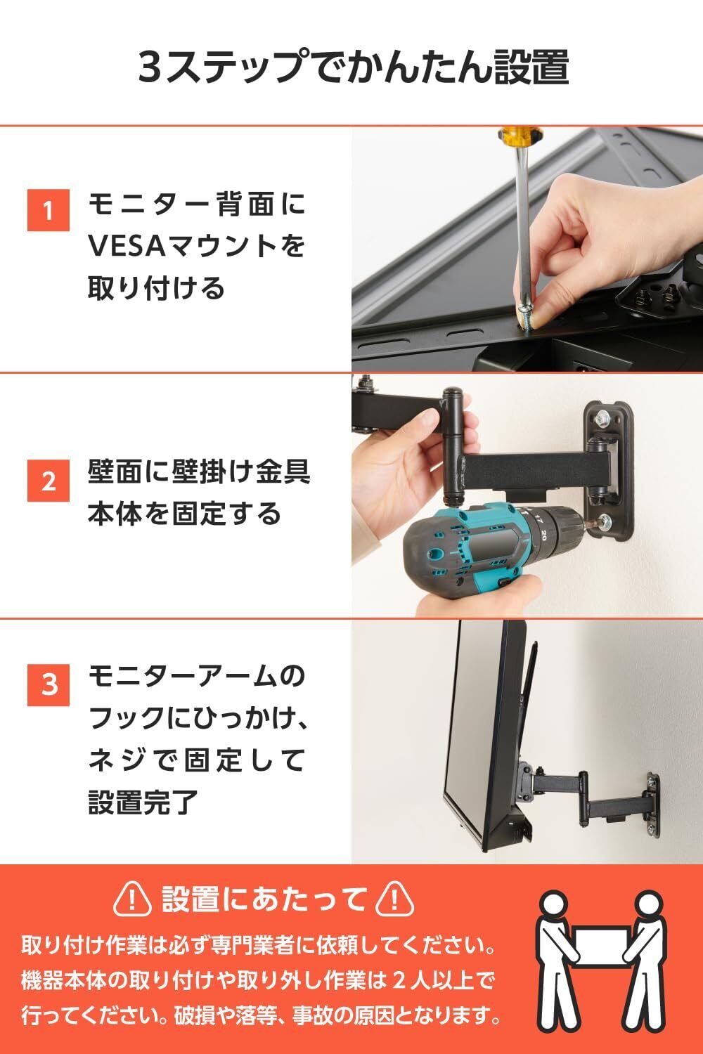 モニター背面にVESAマウントを取り付け、モニターアームのフックにひっかけ、ネジで固定するだけで簡単に設置できます。