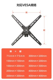 VESA規格(75mm×75mm、100mm×100mm、100mm×200mm、200mm×100mm、200mm×200mm、300mm×200mm、400mm×200mm、300mm×300mm、400mm×300mm、400mm×400mm)に準拠したテレビに対応しています。