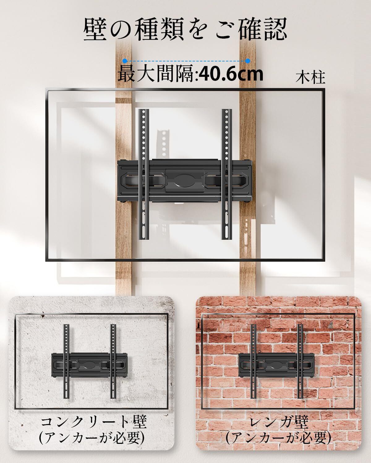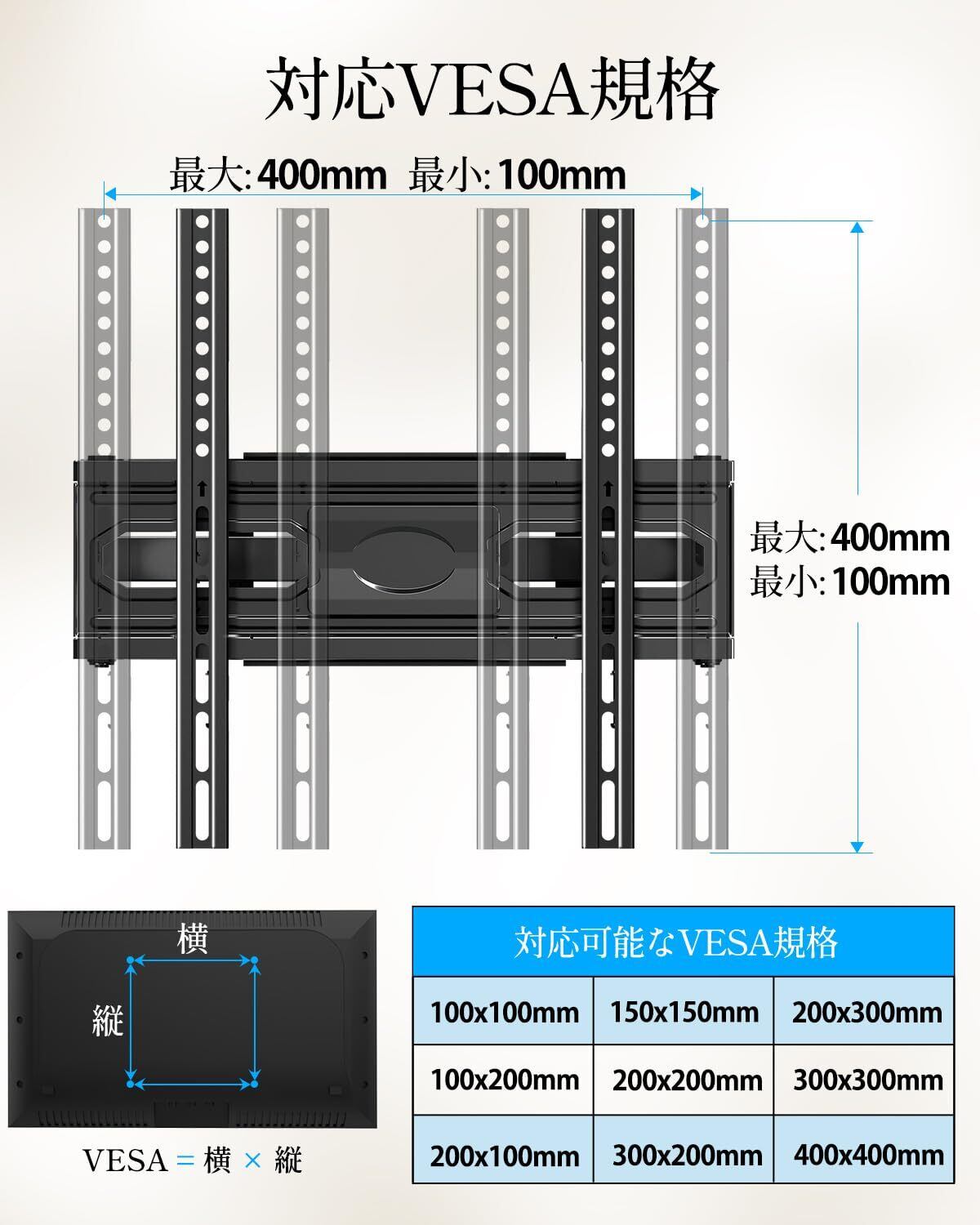 【ご購入前に】本壁掛けテレビ金具の目安対応サイズは26~65インチで、耐荷重は最大45kgです。対応VESA規格(テレビ背面のネジ穴の距離)は横二点間:100~400mm、縦二点間:100~400mm。ご購入前にテレビの情報をご確認ください。対応かどうかを迷う時、以下の手順でご連絡ください。「アカウントサービス」→「注文履歴」→「販売元」→「質問する?」