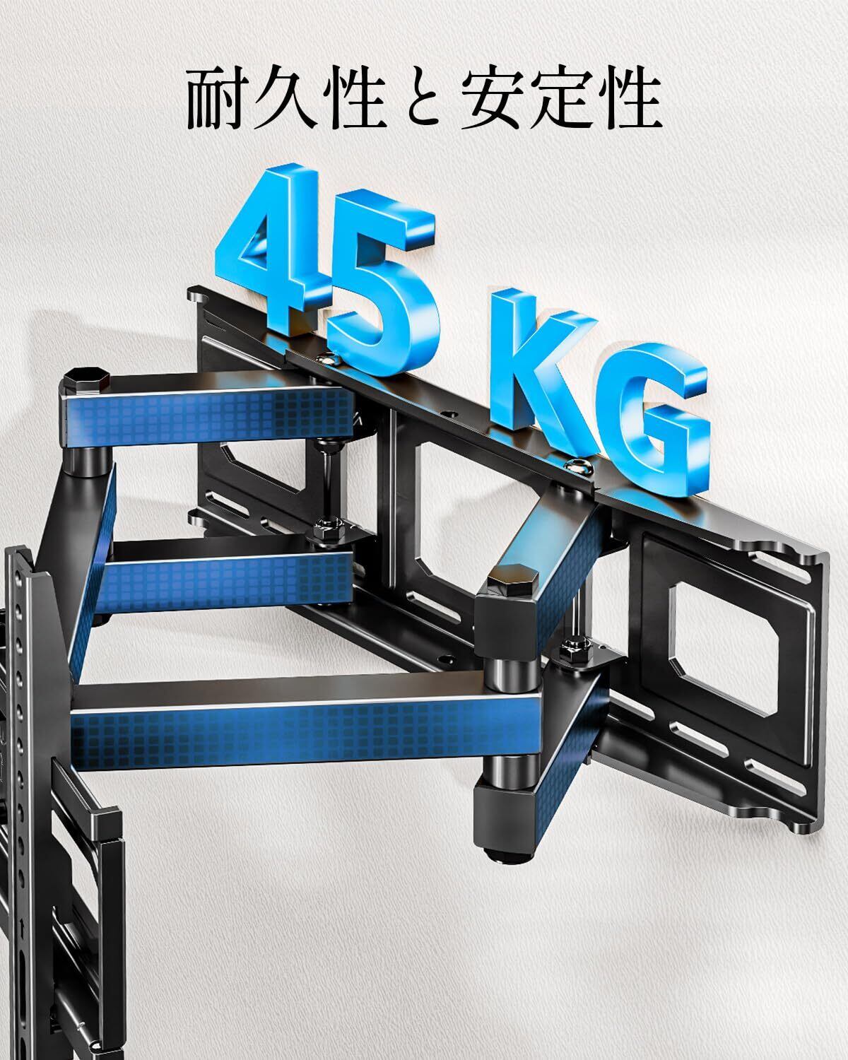 【自由な角度調整で快適な視聴体験を!】フルモーション式のアームにより、上下、左右、前後に多角度で調整が可能です。視聴位置に合わせて自在に角度を変更できるため、快適な視聴環境を実現します。リビングや寝室、オフィスなど、どんな場所でも最適なポジションでテレビを楽しむことができます!