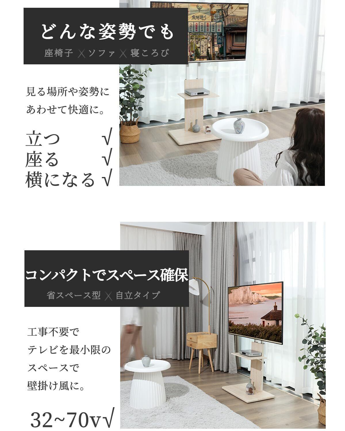 【どこにでも自立タイプ】 床に座ったり、ソファに座ったり、ベッドに横になったり、様々な体勢になる⼀⼈暮らしのワンルーム。⼩回りがきく⾃⽴タイプのテレビスタンドなら気軽に位置や⾓度を変えられ、お部屋のどの位置からでも、どんな体勢からでもテレビを楽しむことができます。