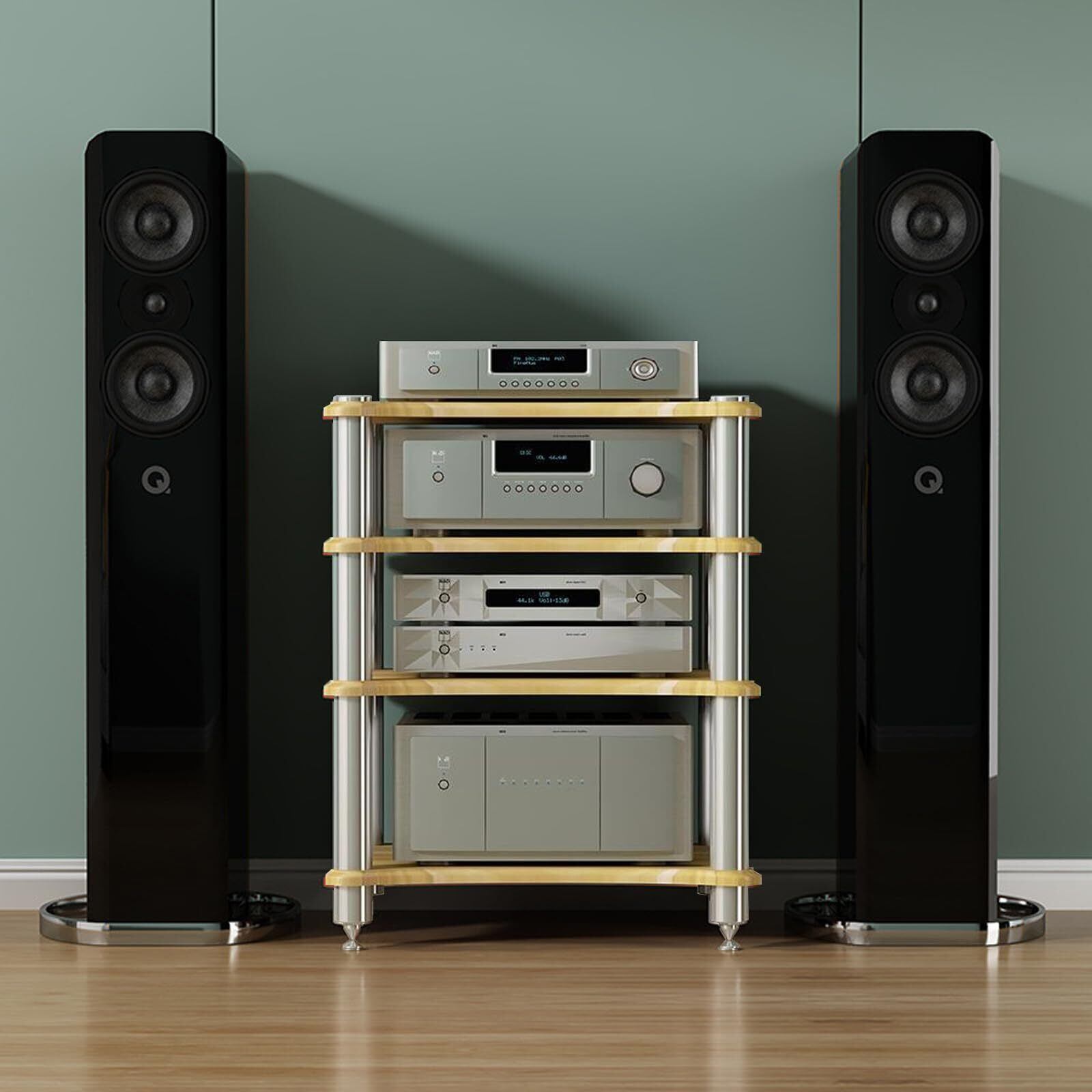 オーディオラック 4段 ゲームラック オープンシェルフ HiFiラック AVシェルフ ステレオスタンドオーディオラック コーナーシェルフ 簡単な組み立て リビングルーム オフィス レコーディングスタジオ(ウォールナット)