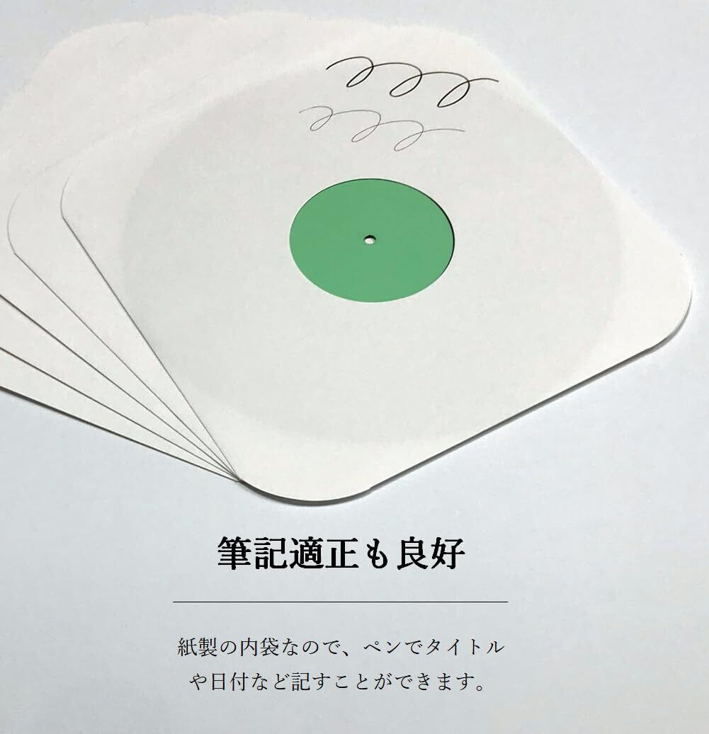 特徴 : (1)ビニール製に比べ静電気が発生しずらい紙製 (2)穴あきレーベル加工 (3)スリーブ・ジャケットに入れやすい角丸(角なし)加工 (4)水性・油性ペンでの筆記適正あり