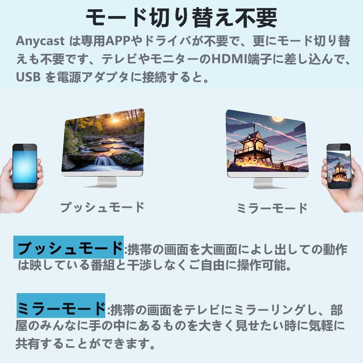 【1080P高解像度・4K高画質】HDMIミラーキャスト 高画質、高音質のHD 1080P対応します。精細な画像、鮮やかな色彩、滑らかな映像を楽しむことができます。タブレットAnycast は専用APPやドライバが不要で、モードの切り替えも不要です。アタプターを差し込んで、同じWIFI環境で初期設定した後、WI-FIに接続されているすべてのデバイスを直接ミラーリング/投影ができます。一回設定してから、二度と設定する必要がありません。その上ケーブル接続の煩わしさから解放られます。