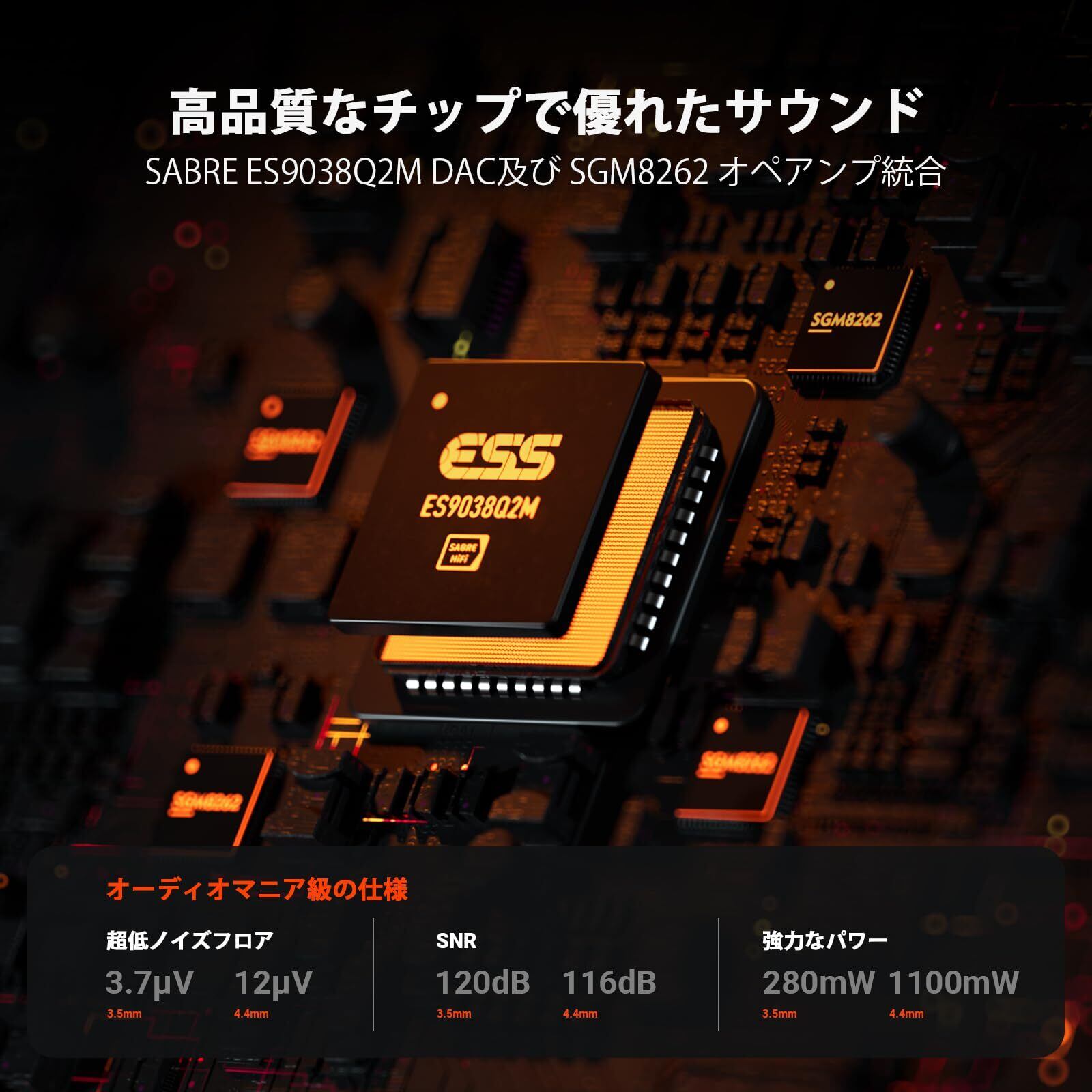 目覚ましいパフォーマンス: ハイエンドのESS SABRE ES9038Q2M DACとSGM8262オペアンプを使用した優れた回路設計により、優れたパラメータがされ、S/N比は120dBと高く、ノイズフロアはわずか3.7μV、THDは0.001%という低さです。4.4mm バランス出力は 32 Ωで 1100mW という驚異的な出力に達し、優れた高解像度機能とクリアな音質により、あらゆるリスニング体験が並外れた感覚の旅になります。