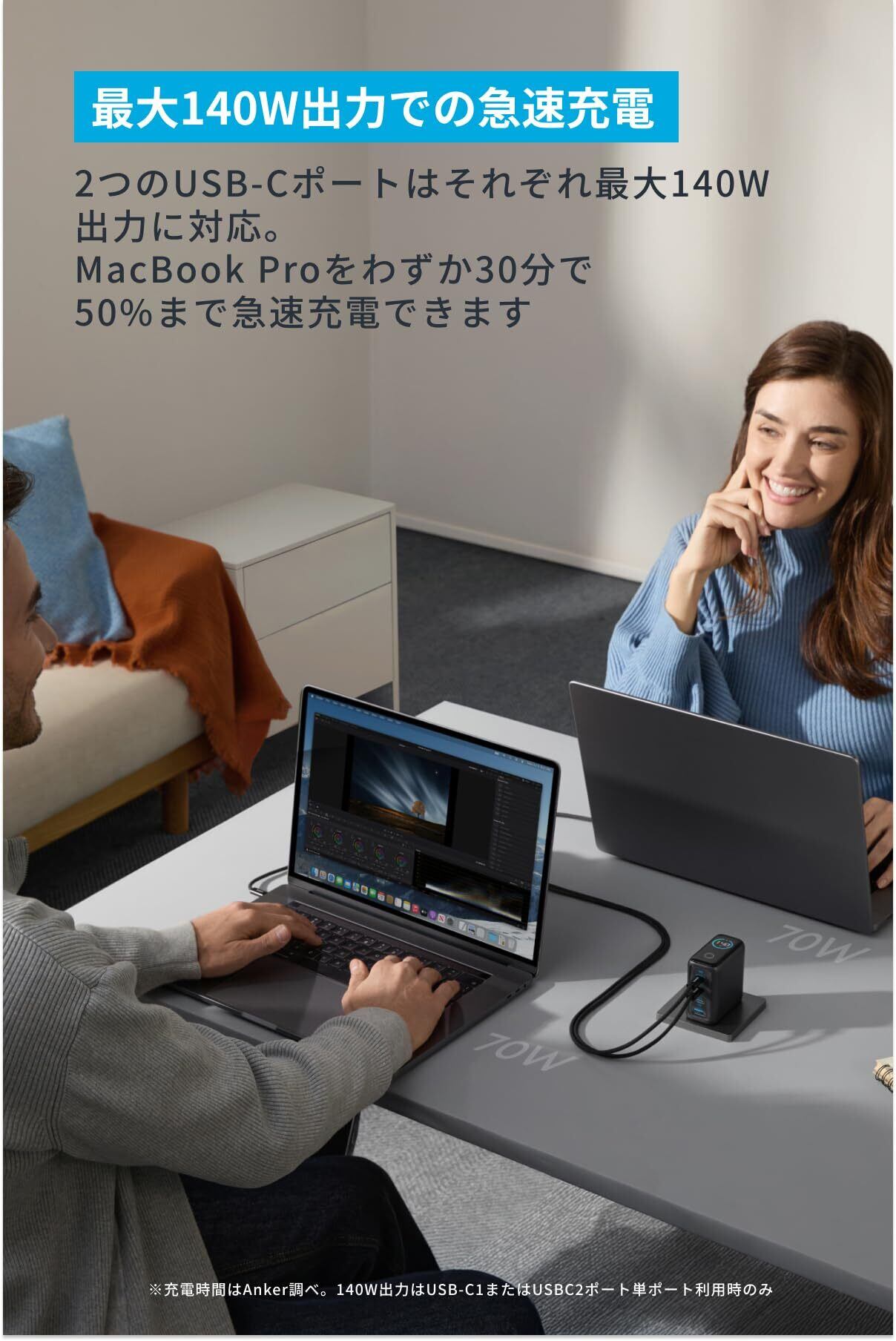 単ポート最大140W出力の急速充電:2つのUSB-Cポートは単ポート最大140W出力で急速充電に対応。16インチのMac Book Proをわずか30分で50%まで充電することが可能です。 (充電時間はAnker調べ。140W出力はUSB-C1 またはUSB-C2ポート利用時のみ)