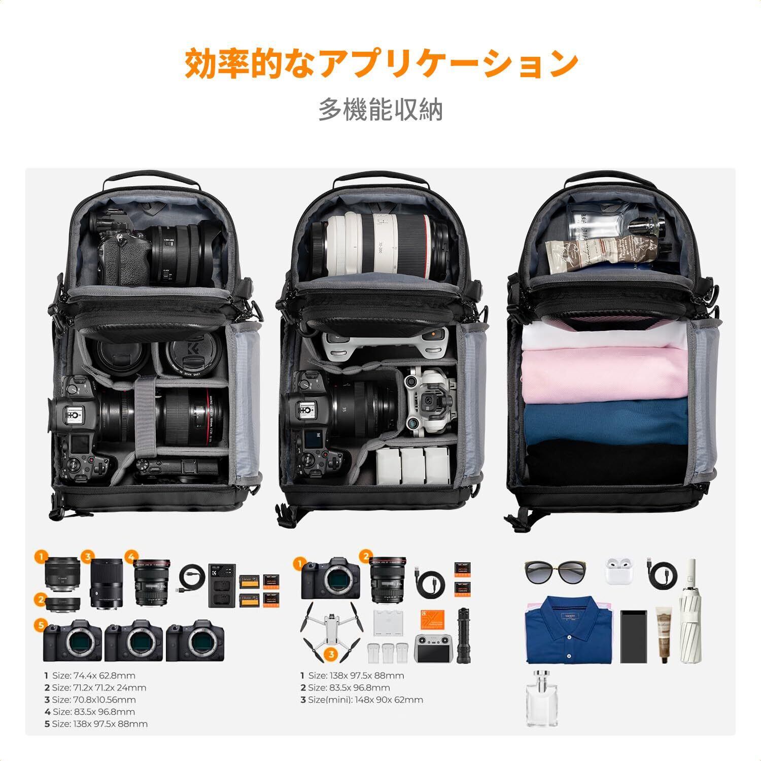 ■【様々なシーンに適用】プロの上下2気室デザイン、3種類の組み合わせる方式は様々な場所に対応し、仕切り板を取り外した後、普通のショルダーバッグとして使用することもできます。旅行やアウトドア撮影に最適です。
