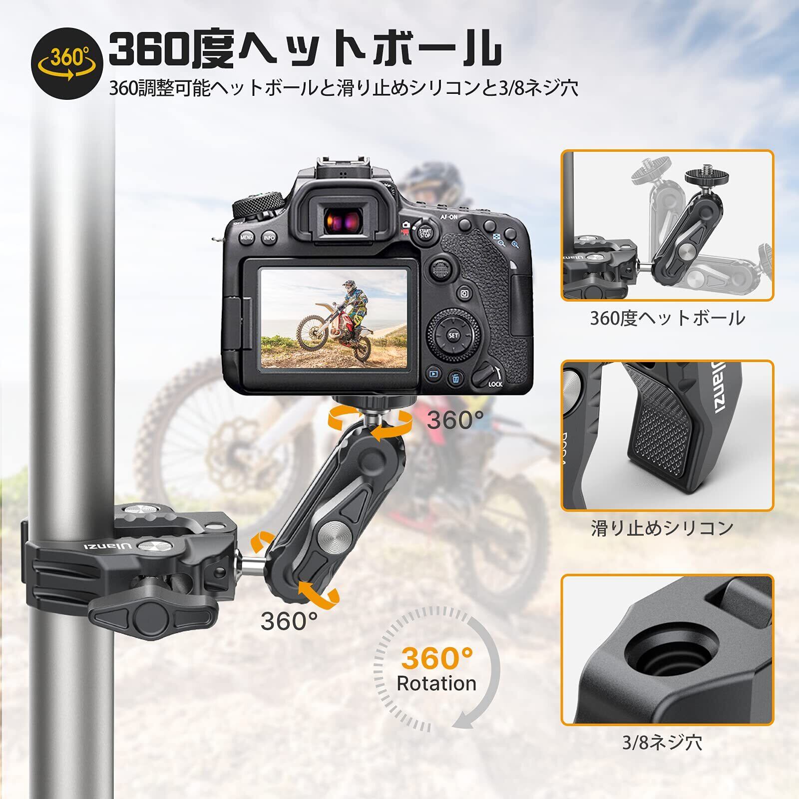 ■【自在な角度調整が可能!】Ulanzi R094スーパークランプボールヘッドアームは、360度回転可能で、自由な角度調整が可能です。撮影や照明機材を最適な位置に固定できるため、理想的なアングルを実現します。バイクやデスクにも簡単に取り付けることができ、幅広いシーンで活躍します。