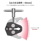 【パイプクランプ】パイプクランプは15mmから40mmまでの器材を挟めることができる強力クランプとして、1/4ネジ穴と3/8穴ネジがありますから、必要に応じてカメラのアクセサリーに取り付けることができます。そして、柔らかいクッションが内蔵されているため、脱落や傷を防止します。