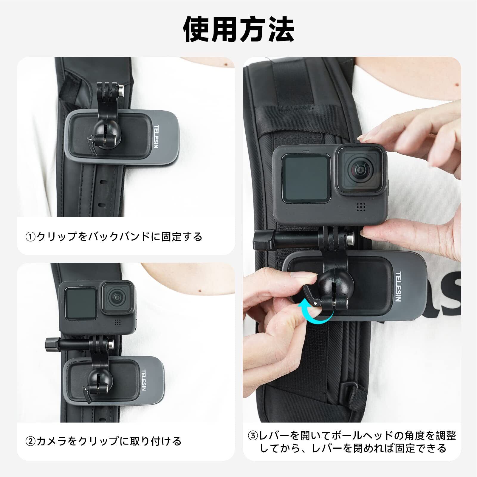 TELESIN 360回転バックパッククリップ バックパックマウント バックパックストラップホルダー チェストマウント GoPro用 アクセサリー Max Hero 13 12 11 10 9 8 7 6 5 Insta360 X5 X4 X3 One RS One Go2 DJI Osmo Action 3 4 5 PRO Pocket 3に適し