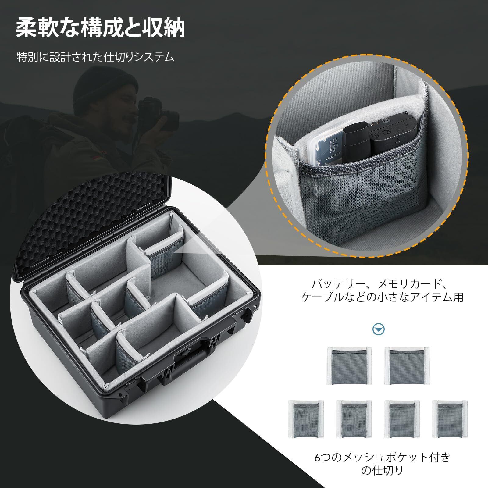 【汎用性の高い収納】仕切りにより、DSLR/ミラーレスカメラ、レンズ、ドローン、リモコン、その他のアクセサリーの組み合わせの収納をカスタマイズ可能。DJI Mavic と Mini などの 2 台のドローンを所有する方は、 2 台を 1 か所に保管し、一緒に持ち出すことができ