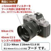 【対応レンズ】NIKKOR Z 28mm f/2.8 SpecialEditionや 同 Z 40mm f/2 Sレンズ等に対応します。Zfcだけでなく、フルサイズのZ7でもそれぞれケラレない事を確認済みです。他のレンズでは、取付径がφ52mmのレンズに取付けが可能です。尚、装着できても、ケラレが発生する場合がありますので、対応レンズにご注意ください。