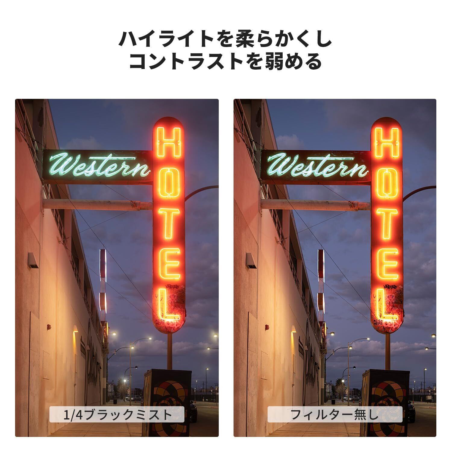 【ソフト効果&コントラスト抑え】67mm ブラックミスト1/4フィルターは人物向けで肌を滑らかにし、光源をやわらかくする効果があり、夜景の光や逆光、木漏れ日などの点光源もフワッと幻想的な雰囲気に仕上げてくれる。ハイライトとシャドウのコントラストを抑え、柔らかく表現してくれる写真や動画に最適。※外装の新旧が混在しますが、中身は同一です。