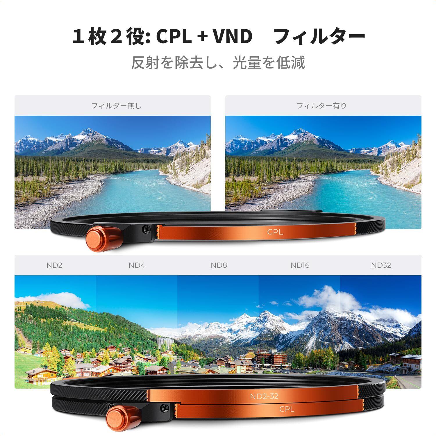 ■特徴: CPLフィルター、可変NDフィルター、ブラックミストフィルター、マグネット式アダプターリング、マグネットレンズキャップ、28層コーティング