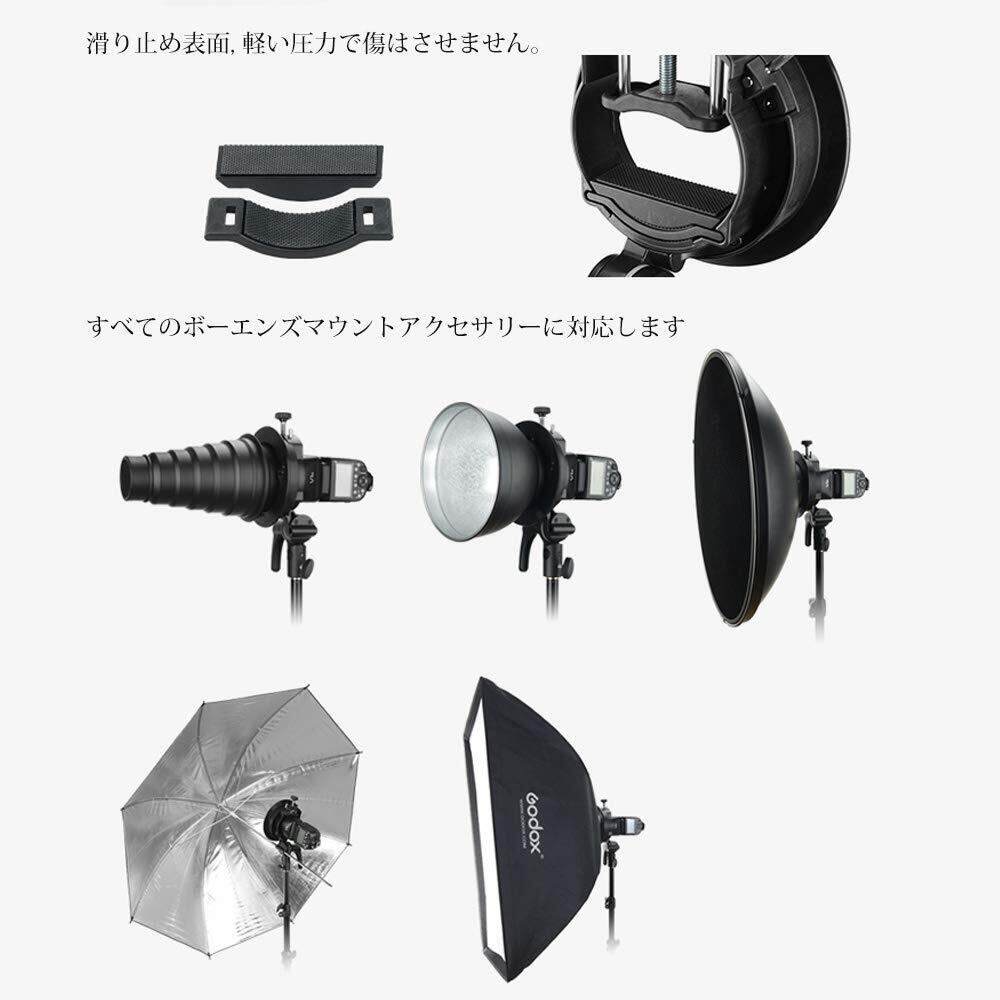 ■特徴: Godox S2ブラケット、ボーエンズマウント、幅広いストロボに対応、軽量・コンパクト設計。