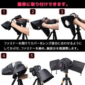 装着方法: カバーのファスナーを開けてレンズ部分に合わせるようにしてかぶせ、ファスナーをしっかり締めてアームカバーを微調整します。