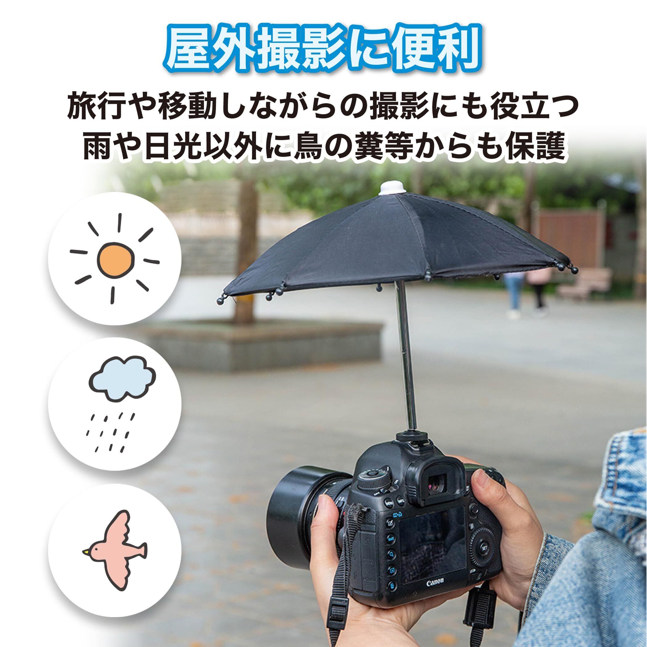 【急な雨や強い日差しから大切なカメラを守る!】突然の降雨や炎天下での直射日光がカメラにダメージを与えないか心配なときに、サッと取り付けられるカメラ傘です。天候が不安定だったり、過酷な状況が予想されたりする場合に役立ちます。旅行や野鳥撮影、屋外イベントでも活躍します。