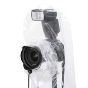 ポリエチレン製のカメラレインカバーです。一見ビニール袋のような外装ですが、巾着状のレンズ用開口と一脚との併用を想定した形状を備えます。光学ファインダーは袋越しに覗くか、接眼部分の通し穴を開けて使用します。その材質上、基本的に何度も使い回せる仕様ではありませんが、収納時は布製の専用レインカバーに比べると大幅にコンパクト。カメラバッグの片隅に入れておくと、いざというときに役立ちます。