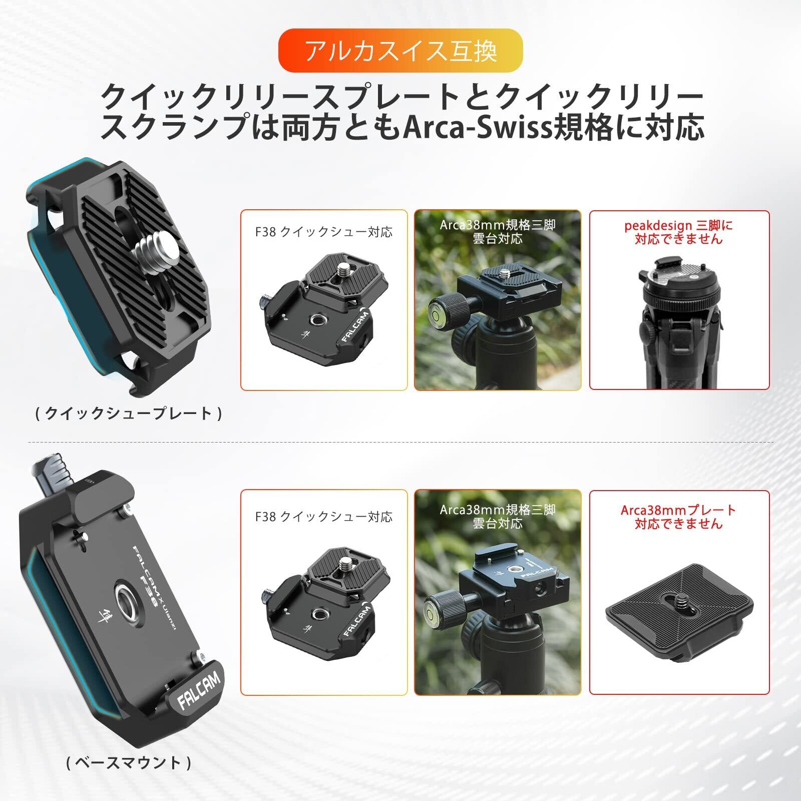 【アルカスイス対応】:クイックリリースプレートとクイックリリースクランプは両方ともアルカスイス38mm標準が付属しており、アルカスイスの雲台側パーツ(クランプ)にセットすることができます。注意:ベースプレートの上にはF38プレートにしか対応できません。ベースクランプはArca38mmプレートも対応できません、アルカスイスの三脚にセットできます。