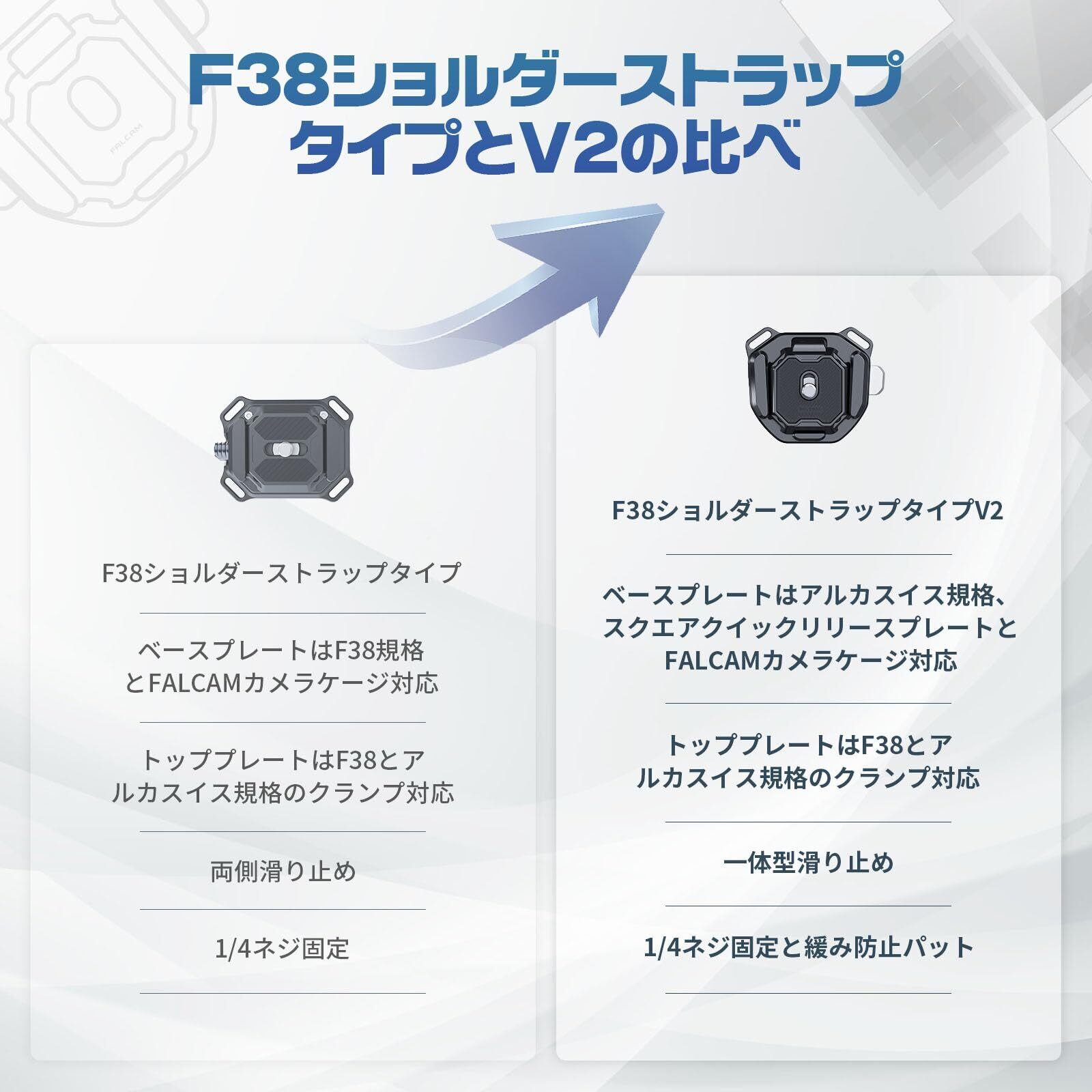 【幅広い互換性】F38クイックリリースショルダーストラップタイプV2のプレートは他のF38クイックリリースベースと互換性があるだけでなく、ショルダーストラップとも互換性があります。カメラを縦位置に構えた時にストラップが邪魔にならないで、ストラップに装着した時レンズが下向きになるんで、傷つきにくいです。カメラやショルダーストラップを外す必要がなく、ワンクリックでロックが解除されます。F38クイックシューは元の版本と違い、市販のほとんどのArca規格に対応でき、アルカスイス規格の三脚の雲台との互換性も高いです。完全に自由なクイックリリースを体験することができます。*注意:クイックリリースベースの互換性を高めるため、プレートを取り付ける際に多少の音がしますが、これは正常な現象です。