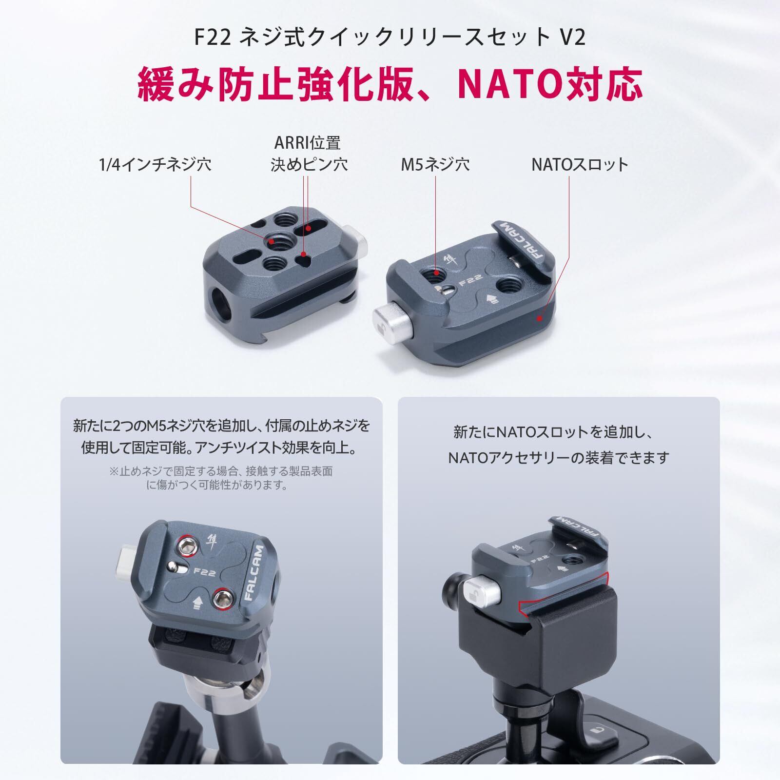 ▶【幅広い互換性】1/4インチネジを採用しているので、F22 QRシステムを三脚、一脚、ボールヘッド、モニター、マイク、フィルライト、バッテリー、シグナルレシーバーなどの機器と簡単に接続できます。F22 QRシステムを使えば、従来のクイックリリースプレートを使うよりもはるかに素早くアクセサリーを交換することができます。