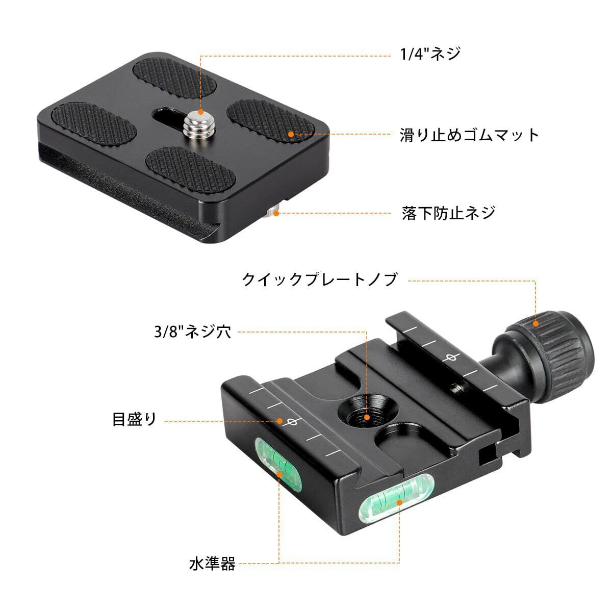 1/4 インチおよび 3/8 インチのネジアダプターは、ほとんどの DSLR、三脚、一脚、スタビライザー、ジンバル、ボールヘッドに適合します。 アルカスイスのクイックリリースプレートと互換性があります。