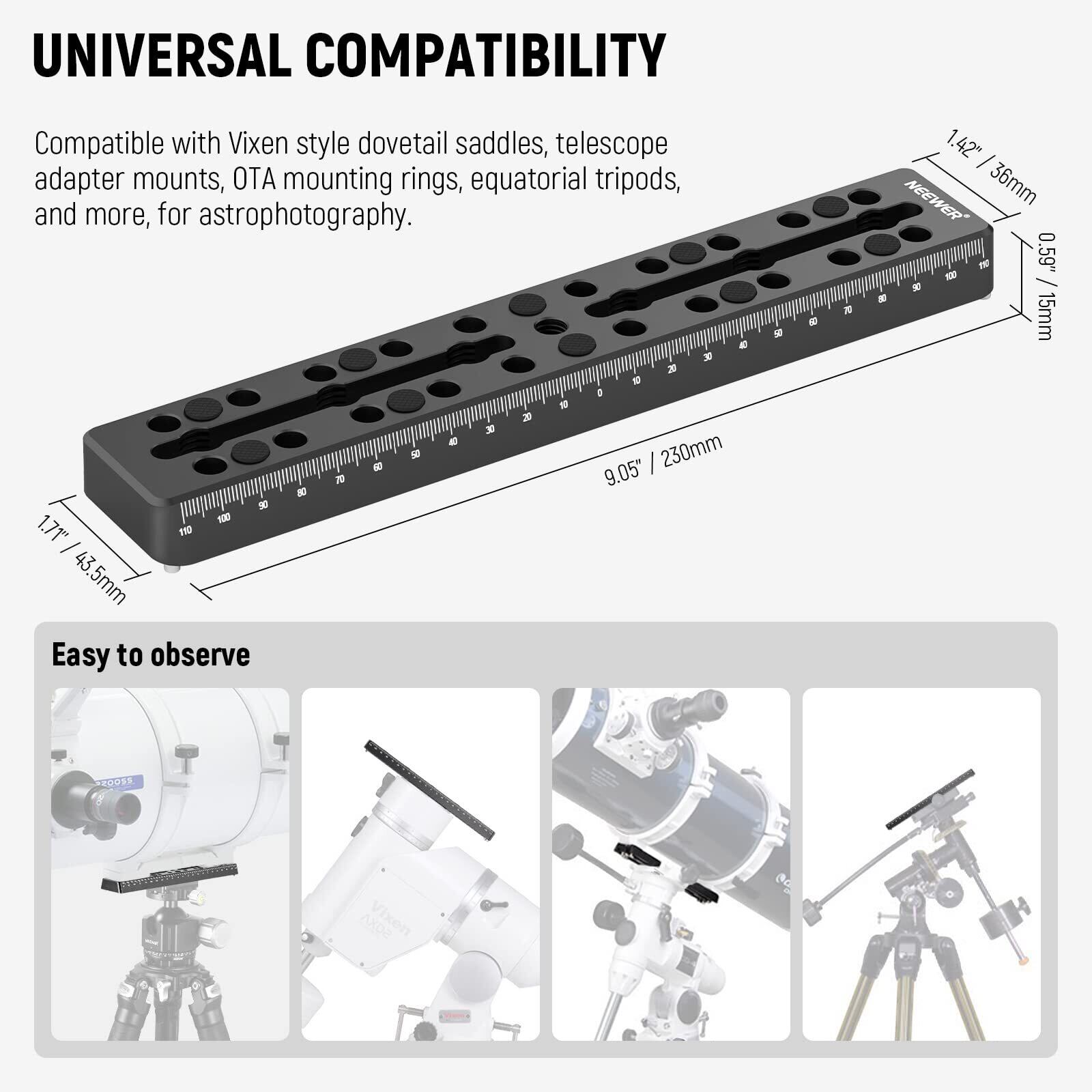 ■【簡単に安全にマウント!】NEEWERの9インチレールバーは、金属製の頑丈な構造で、カメラや望遠鏡をしっかりと固定します。Vixenスタイルのダブテールプレートを採用しているため、スムーズで安定した観察が可能。天体観測や野外撮影、様々な場面で活躍します。