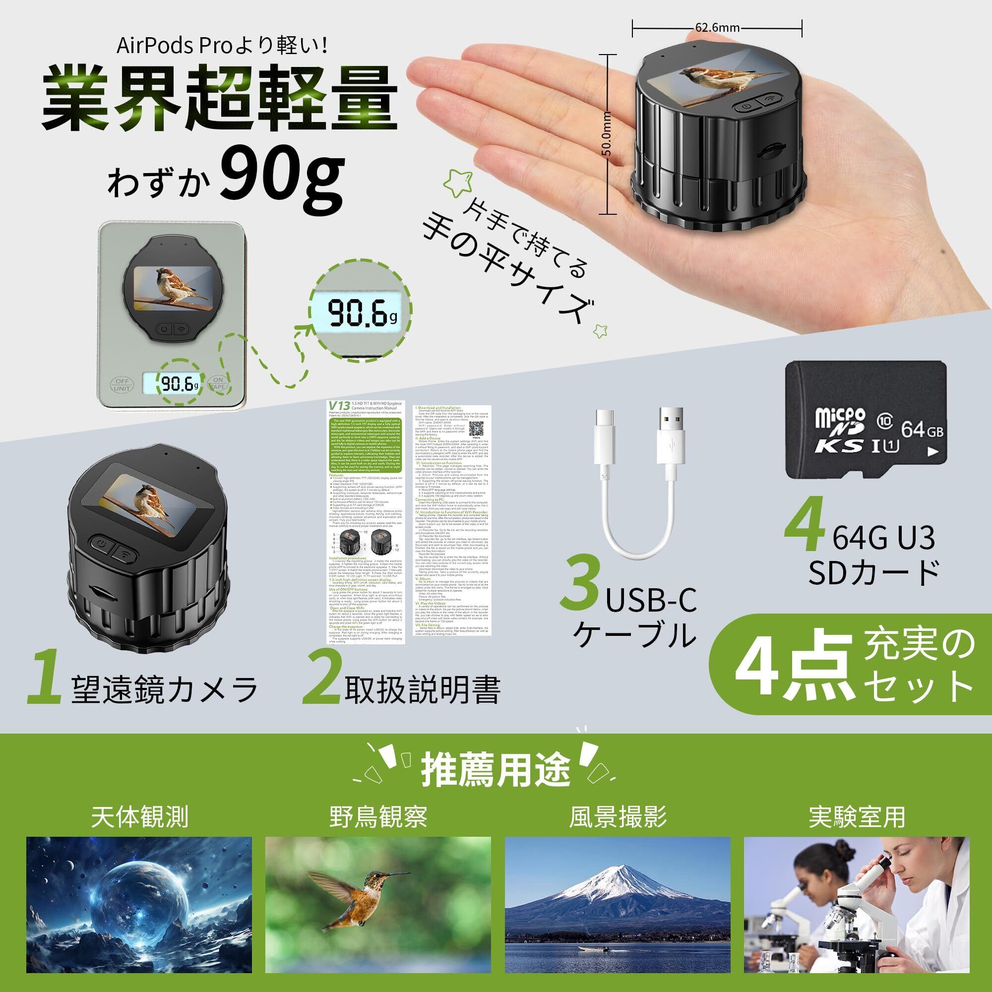 【特別価格】64GB TFカード付き2025年10月新登場WiFi望遠鏡カメラ 4MPデジタル画像 3時間連続録画 望遠鏡用アクセサリー ワイヤレス電子接眼レンズ 2Kビデオ録画 28-50mmフィールドスコープ用アクセサリー1920x1080P電子接眼レンズ スマホ接続可 アイピースアダプター 天体望遠鏡アクセサリー 望遠鏡顕微鏡アクセサリー 単眼鏡/双眼鏡/顕微鏡対応 天体観測用 野鳥観察用 初心者に向け
