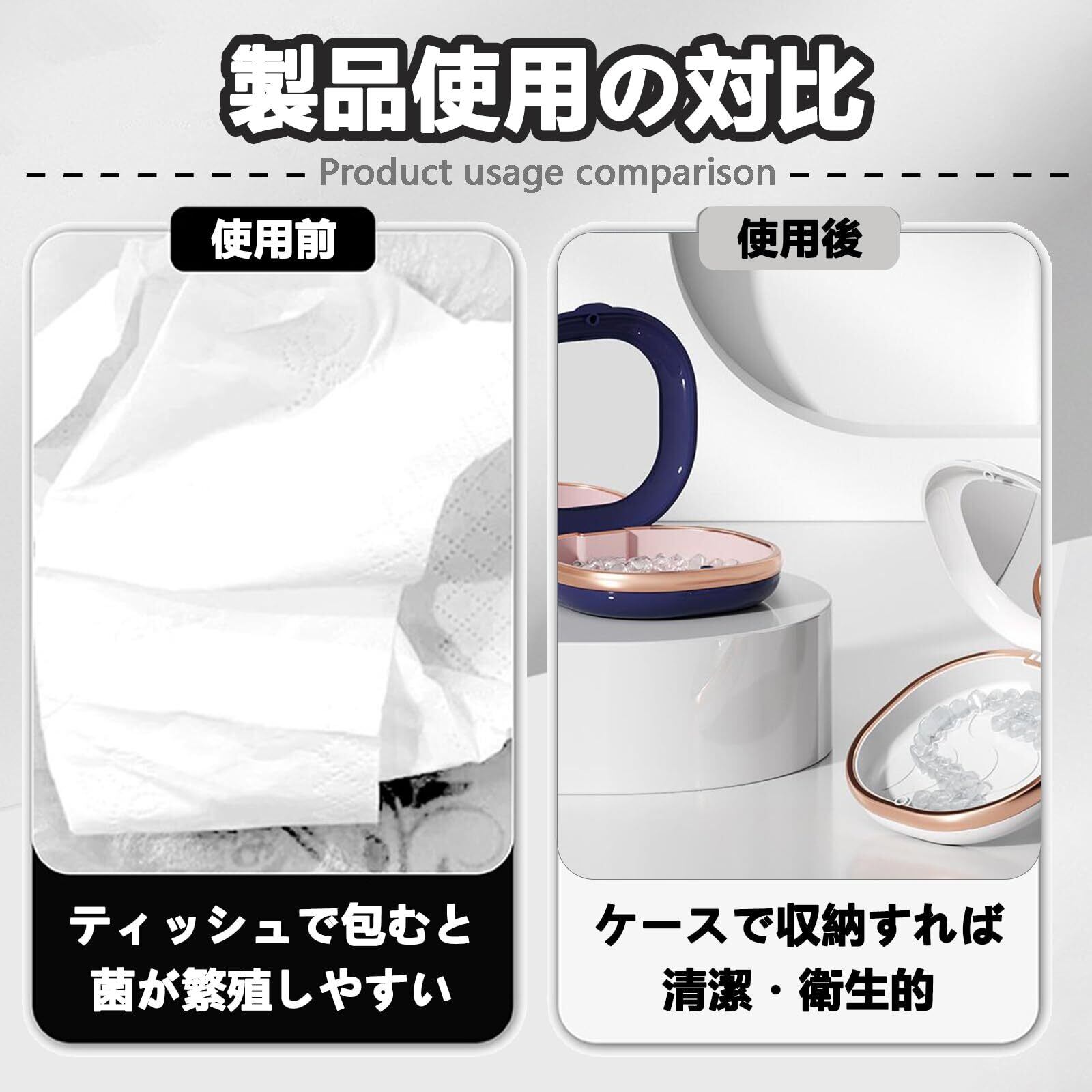 【持ち運び・使いやすい】マウスピース ケースのサイズは8.45 x 8.45 x 2.5 cmとコンパクト、重さ:63g、ポケットやバッグに入れてもかさばらず、持ち運びに便利です、リテーナーケースとしても使える広めの面積設計で、さまざまなマウスピース入れとして活用できます、それだけでなく、鏡がついているため、まうすぴーすけーすとして使用時の利便性も抜群です、カラーはホワイトとダークブルーの2色からお選びいただけます