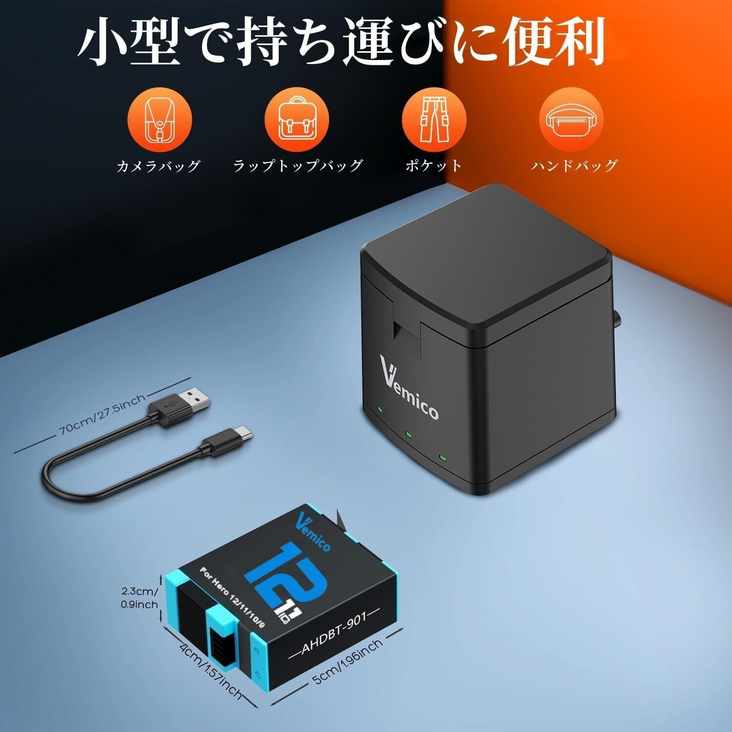 ■特徴: Vemico Hero 12バッテリー急速充電器セットは、充実した性能と便利な機能で、あなたの撮影ライフをサポートします。ぜひ、手に取ってその違いを体験してください!
