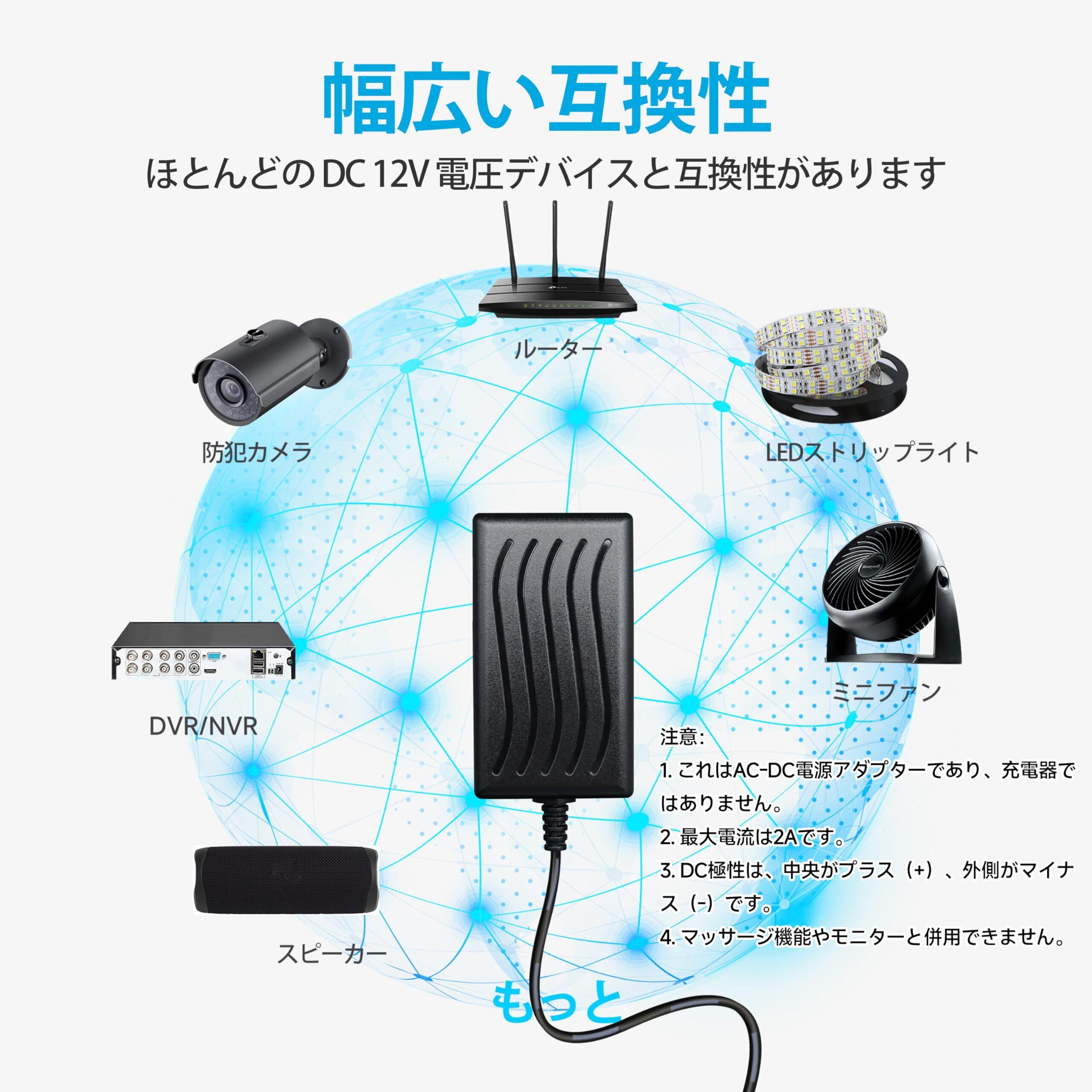 [互換性と幅広い用途]---CCTVセキュリティカメラ、DVR NVR監視システム、LEDストリップライトなど、2A / 2000mA(0.1A / 100mA〜2A / 2000mA)の出力負荷で12V出力を必要とするほとんどの電子機器と互換性があります。アダプタは、さまざまなデバイスに応じて出力電流(最大2A)を調整します。注意: このアダプタはマッサージ、モニターでは動作しません。