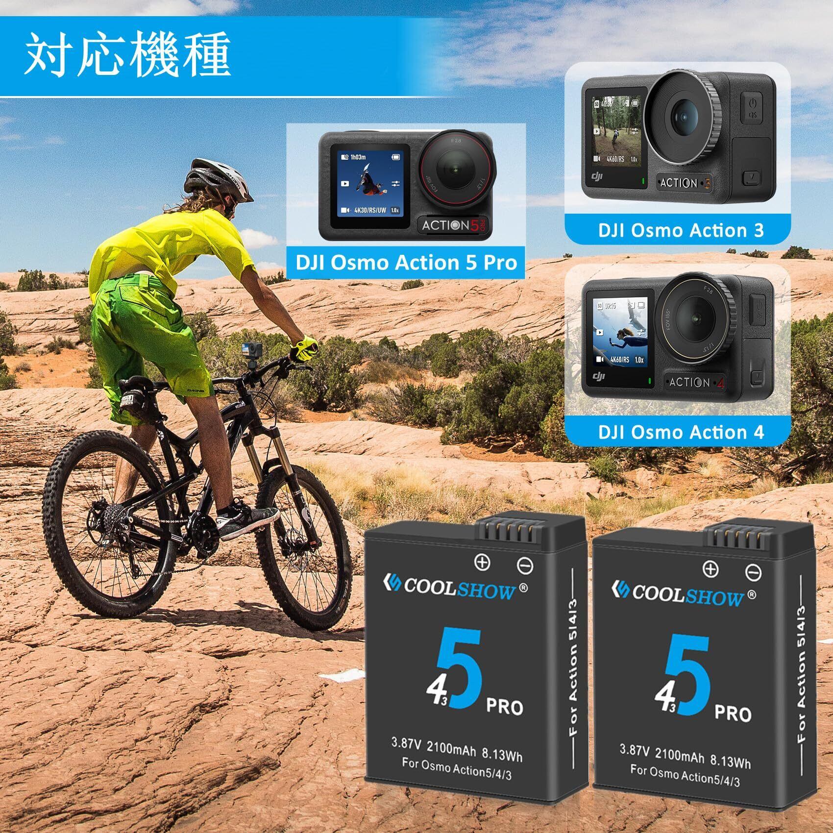 【対応機種】COOLSHOW DJI Osmo Action 5 Proバッテリーは、純正のOsmo Action 4/3バッテリーと交換し、Osmo Action 4,Osmo Action 3カメラとのみ互換性があります。