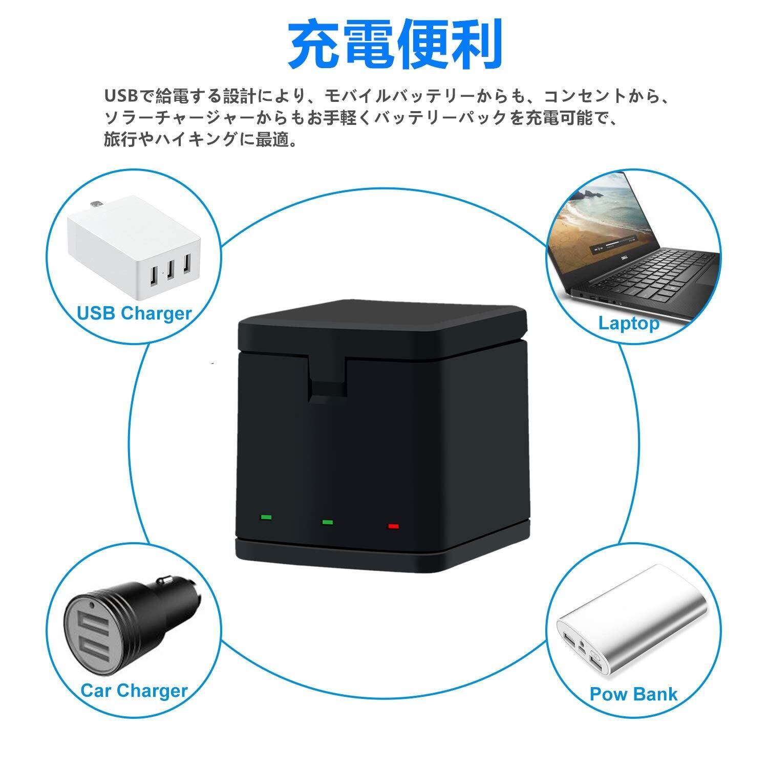 ■【互換性の高いバッテリーセット!】本製品はGoPro HERO 8 Black、Hero 7 Black、HERO 5 ブラック、Hero 2018に対応しており、さまざまなシーンで活躍します。カメラ愛好者には欠かせない、予備バッテリーとしてもおすすめです。