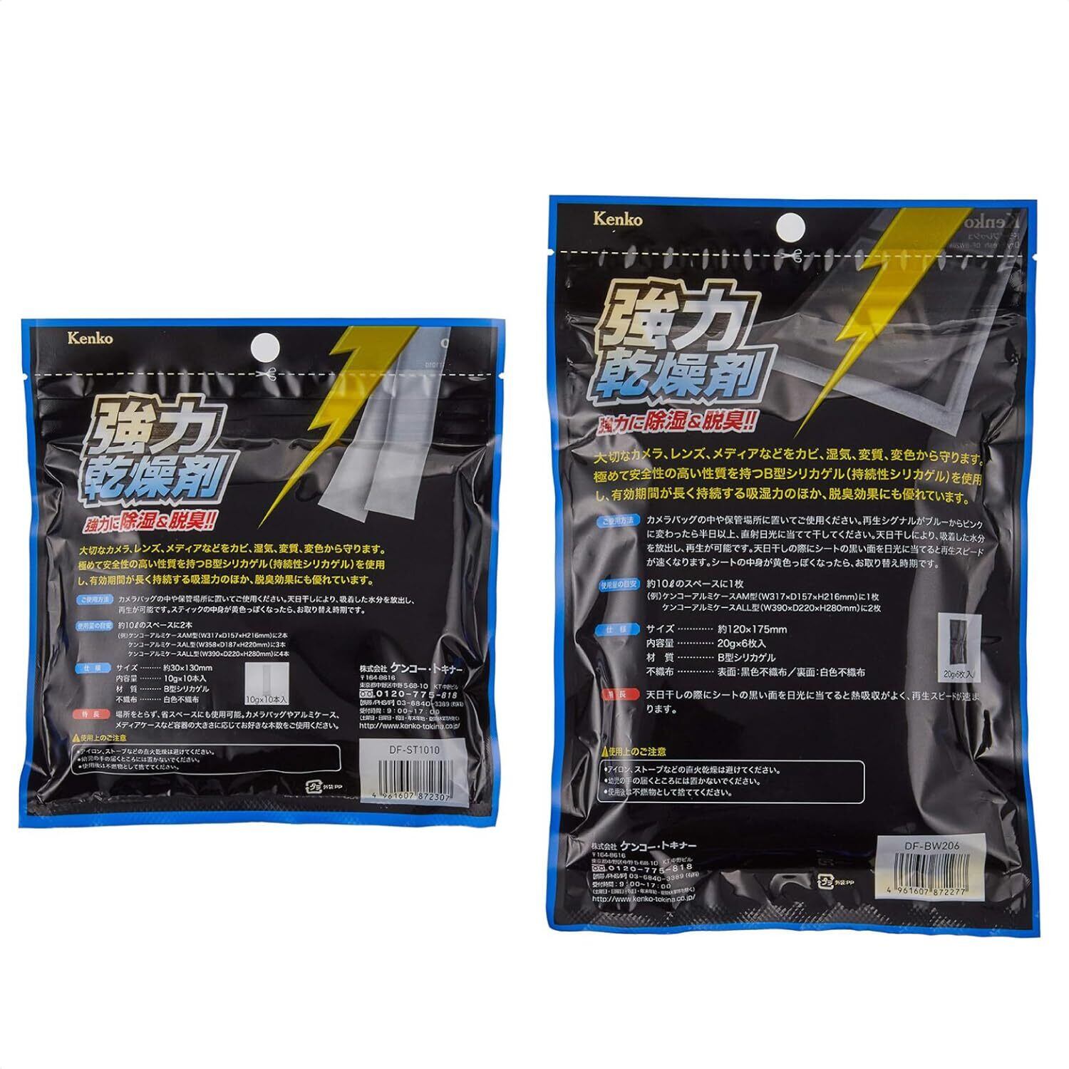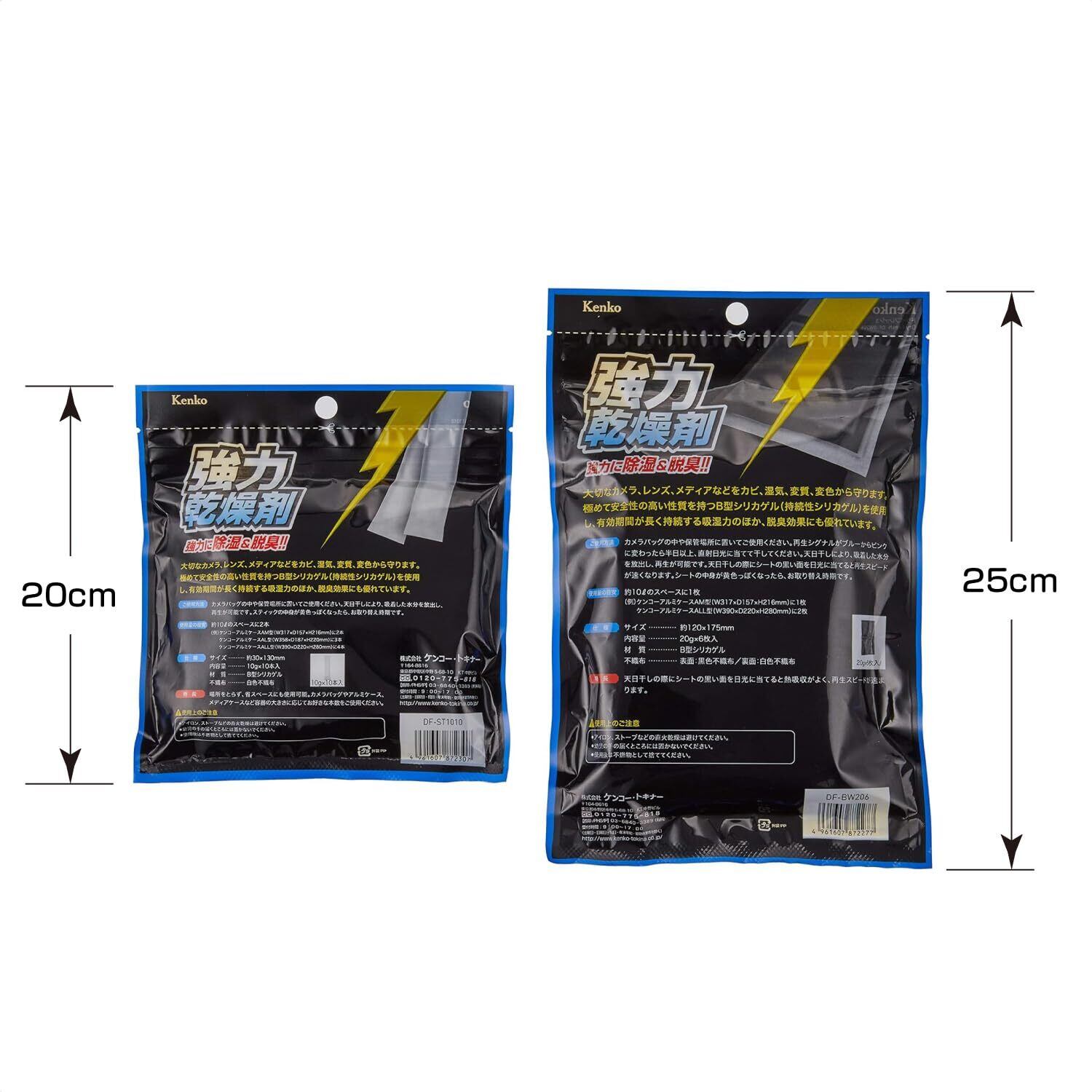 スタイル:スティック 10本& シート 6枚セット 「Kenko 強力乾燥剤 ドライフレッシュシリーズ」は、カメラ・レンズなどの機材をを湿気から守る強力乾燥剤です。カメラ、レンズなどを保管する際、強力な除湿力で湿気を除去。カビ、湿気、変色から守ります。また脱臭効果にも優れています。お徳用のまとめ買いセット。●繰り返し使用でき、さらに調湿作用、消臭効果もある「B型シリカゲル」採用。使い捨てタイプの乾燥剤の主な成分は「酸化カルシウム(Cao)」であるのに対し、「Kenko ドライフレッシュ」は「B型シリカゲル」を採用。バイオリンやピアノなどの楽器用としても使用されるB型シリカゲルの大きな特長は「調湿作用」。高湿度下では強力に湿気を吸収し、低湿度下ではほどよく水分を放出して、50%前後の湿度を保ちます。また、除湿効果が落ちてきても、天日干しすることで乾燥し、再生が可能。繰り返し使用することができる優れものです。「DF-BW206」には、天日干しをする際に効率よく熱を吸収するよう片面を黒色にし、さらに乾燥時期の目安になる再生シグナル付。(再生シグナルがブルーからピンクに変わったら、吸湿力が低下していますので直射日光に当てて干してください。)「DF-ST1010」は、狭いところにも入れられるスティックタイプ。乾燥剤を入れるスペースがあまりない場合や、乾燥剤を目立出せたくないときなどに特に重宝します。※天日干しにより、吸着した水分を放出し、再生が可能です。シートの白い面が黄色っぽくなったら、お取りかえ時期です。