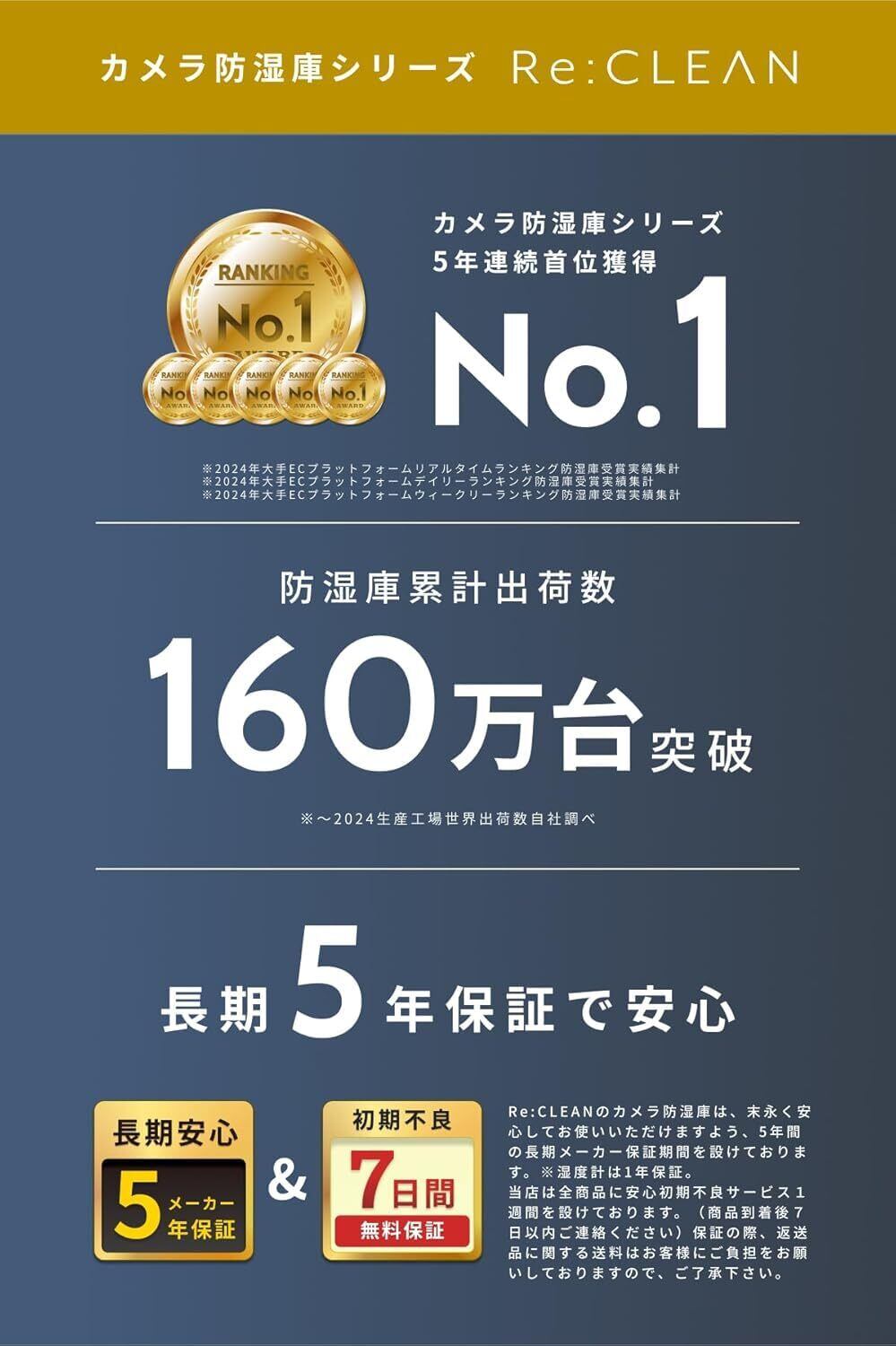 【限定セール】Re:CLEAN 防湿庫 70L NEXT 庫内充電可能 デジタル湿度計 5年 ドライボックス タッチパネル 庫内灯 カメラ収納ケース カビ対策 鍵付き リクリーン