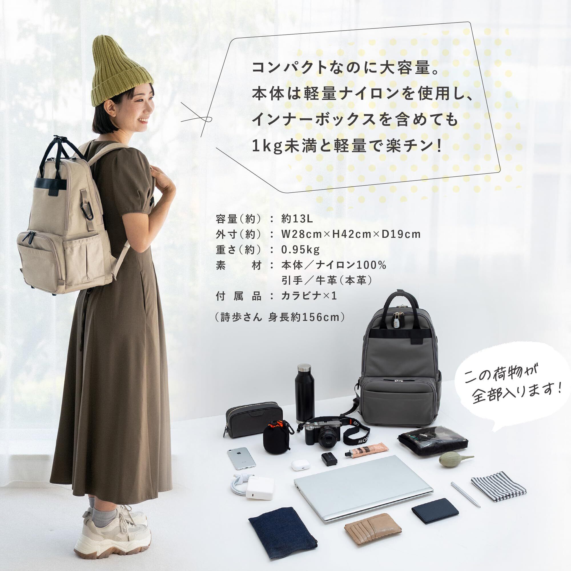 【製品情報】容量:約13L、外寸(約):幅28cm、高さ42cm、奥行き19cm、重さ:約0.95kg(インナーボックスを取り外した場合 約0.85kg)、素材:本体/ナイロン100%(撥水加工)、皮革部分/牛革(本革)、付属品:カラビナ、生産地:中国、商品企画・販売者:株式会社ウエニ貿易(日本)