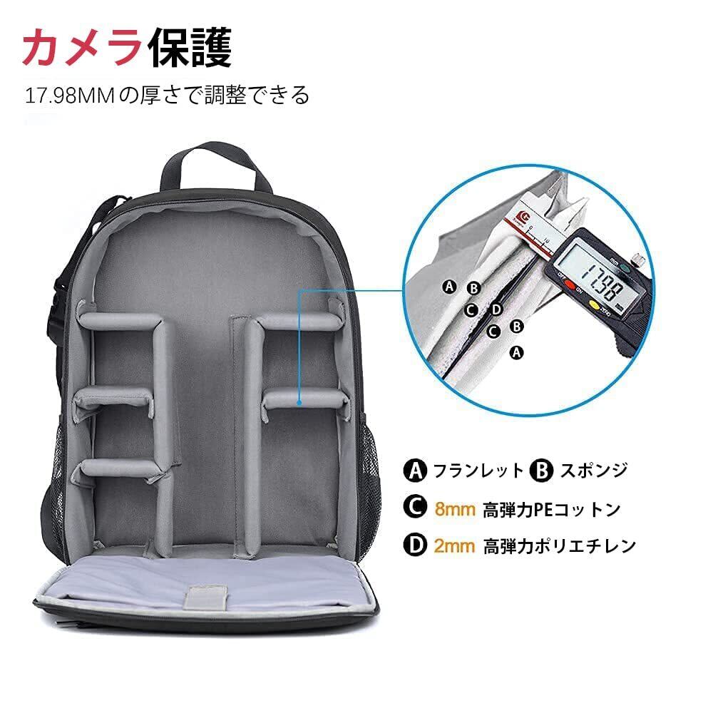 【カメラリュック多重保護で実用】カメラバックには5枚の取り外し可能な仕切り板や1枚のゴムバンドが付属されております。あなたの必要やお好みに応じてご自由に仕切り板を調整でき、空間を最大限に利用できます。クッション仕切り板の厚さは約18mmで、カメラやレンズの落下や衝撃を防止し、より良く保護することができます。