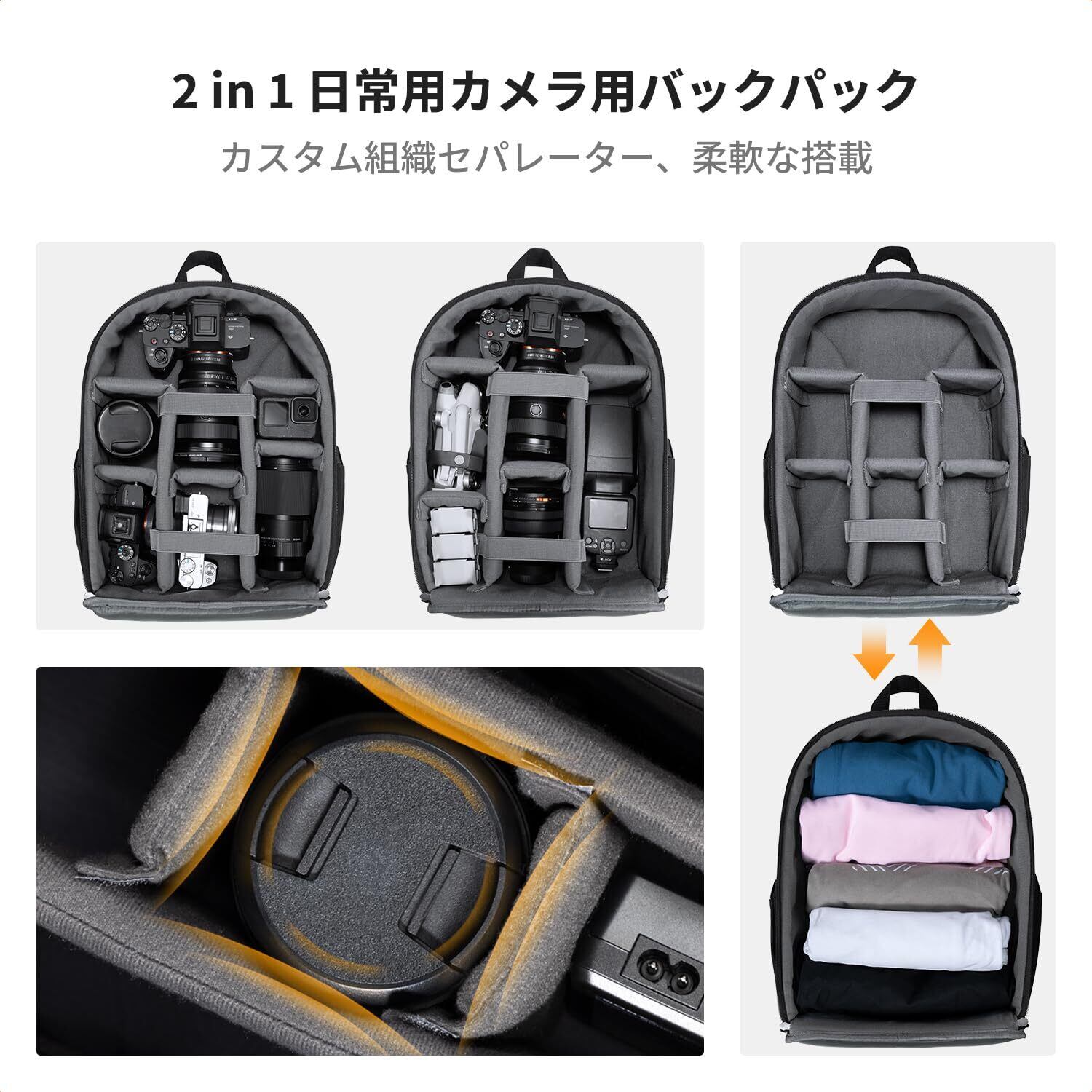 【180°広い開閉カメラリュック】撮影バッグを180°開けでき、物の確認や機器のアクセスが簡単です。取り外し可能の仕切り板、また、内部には取り外し可能な仕切れ板があります、ご自由に組み合わせることができ、収納にもより便利です。マジックテープを取り外せば、通勤バックパック、日常用バックパックとしても使える。