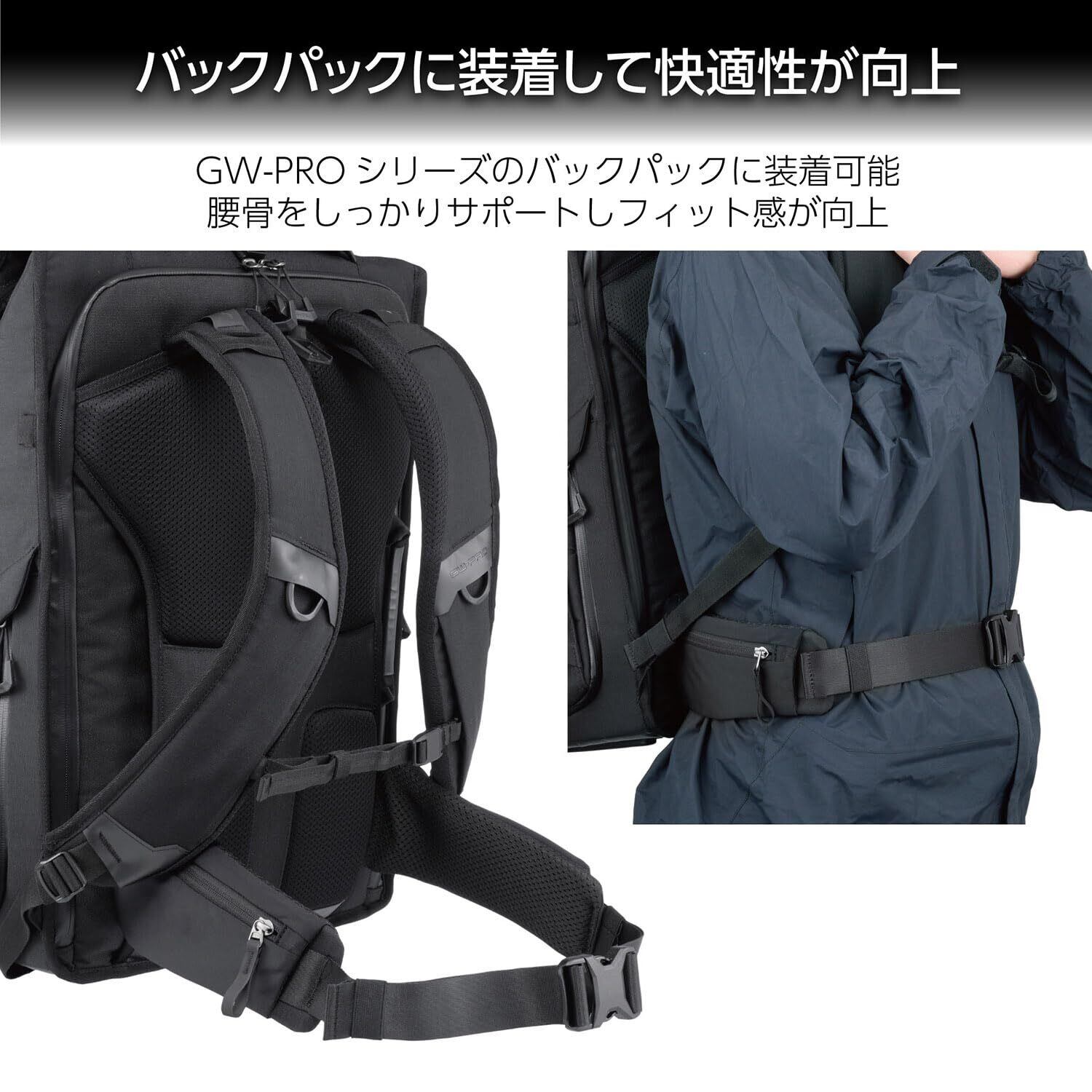 GW-PROシリーズのバックパックやスリングショルダーに装着して快適性を向上させるウエストベルト