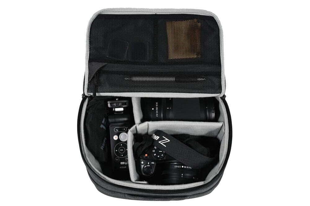 機能性が高く持ち運びに便利な本製品は、プロ向け・ハイアマチュア向けのカメラやレンズを複数収納でき、カードやクロス、小物を収納できるポケットを装備したNikon Z シリーズ専用のバッグインバッグです。