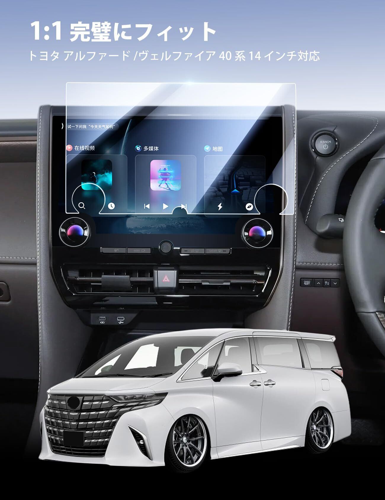 【1:1完璧に対応】トヨタ 新型アルファード 新型ヴェルファイア 40系 14インチの専用画面保護フィルムです。対応車種:新型 アルファード・新型 ヴェルファイア 40系 2023.6~現行。適応型式:AAHH40W、AAHH45W、TAHA40W、TAHA45W、AGH40W、AGH45W。適応グレード:Z 、Z Premier、 Executive Lounge。Lamicallカーナビフィルムは端末にピッタリして、1:1高精度カットの強化ガラスフィルムで、ご愛車のナビ画面を完璧に保護します。ご注意:ご購入の前に是非ご車種に対応できるかどうか再度ご確認ください