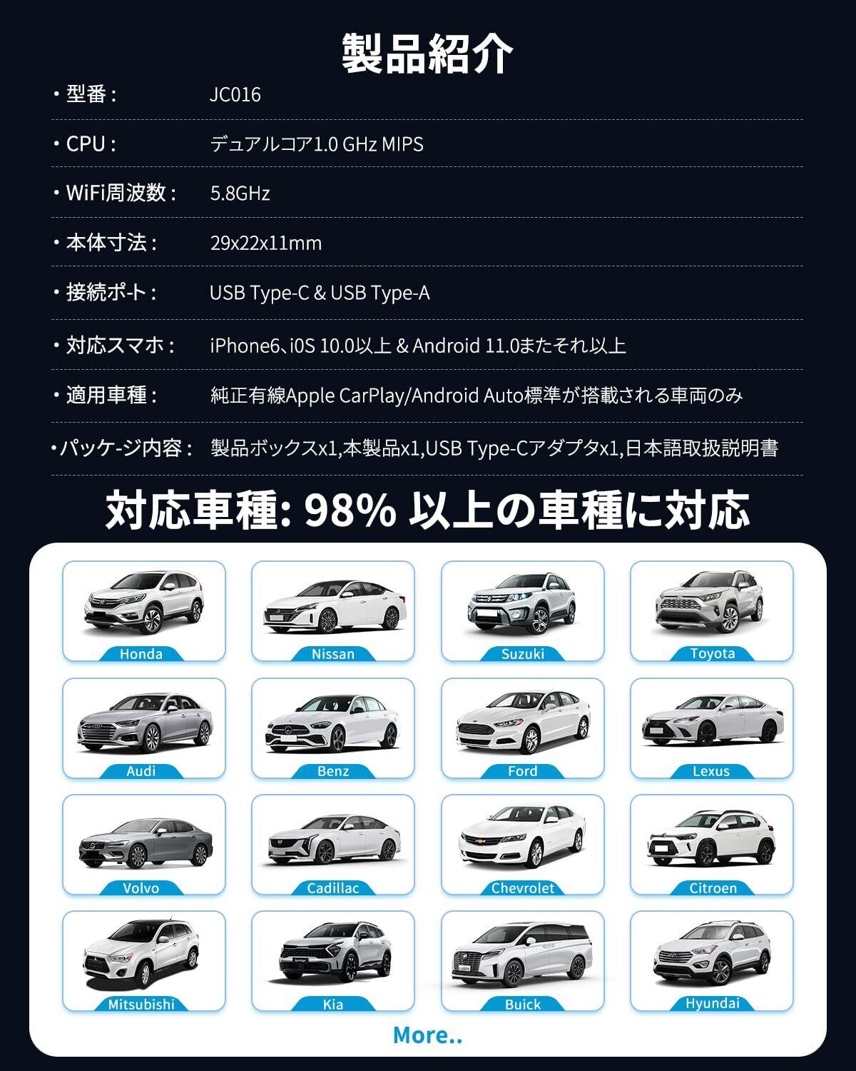 【 ご購入前に必ずご確認ください】本製品は純正CarPlay / Android Autoの“有線接続をワイヤレス化”するアダプターです。新たにCarPlay機能を追加することはできません。例:有線CarPlayのみ対応の車両ではワイヤレスCarPlayのみ利用可能で、ワイヤレスAndroid Autoには変換できません(逆も同様)。また、CarPlay / Android Autoの仕様上、動画再生はできません。