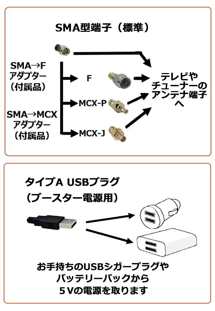 【ご注意!】 ①ブースター用のUSB電源(USBシガープラグやバッテリーパック等)をお持ちですか? 本商品は ブースター内蔵 のため、電源が無いと受信できません。 ②地デジテレビの周波数帯(UHF)ではアンテナを数cm移動しただけでも受信状態が大きく変化することがあります。 ある場所で受信状態が悪くても少しの移動で全く良くなることも、またその逆もあります。 ③お手持ちの機器の取扱説明書をお読みの上、アンテナ端子がSMA、F、MCXかどうか、ご購入前によくお確かめください。 ④おクルマに取付の際は、ルーフの表面や本商品の底面のホコリや汚れがありますとおクルマの塗装を傷付ける恐れがあります。必ずきれいにしてからお取付けください。