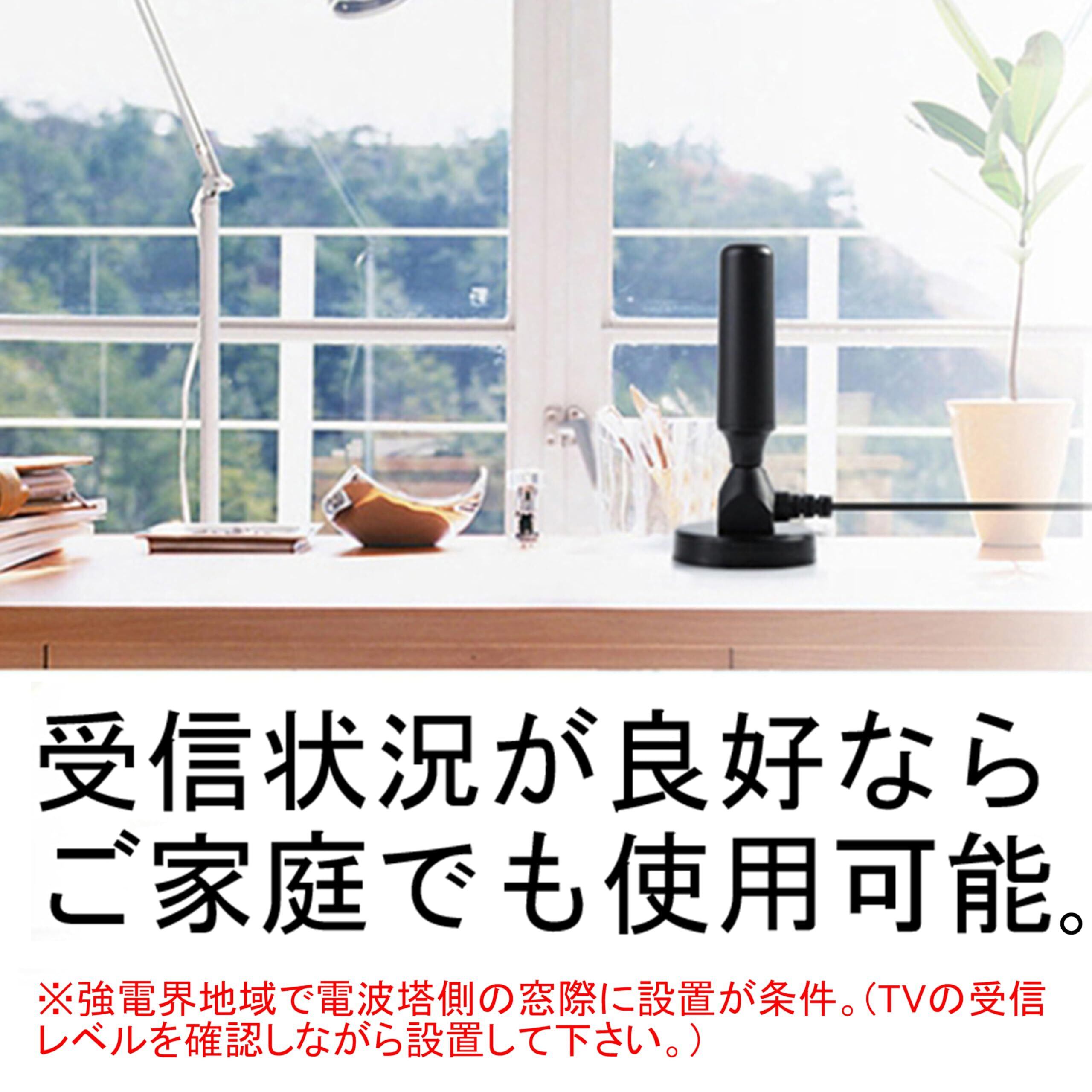 サイズ(約):11cm×6.5cm(台座) ケーブル長(約):5m ケーブル径(約):3mm 受信部はネジで取り外し可能。受信周波数:470~860Mhz(13ch~62ch) アンテナ利得(感度):12db
