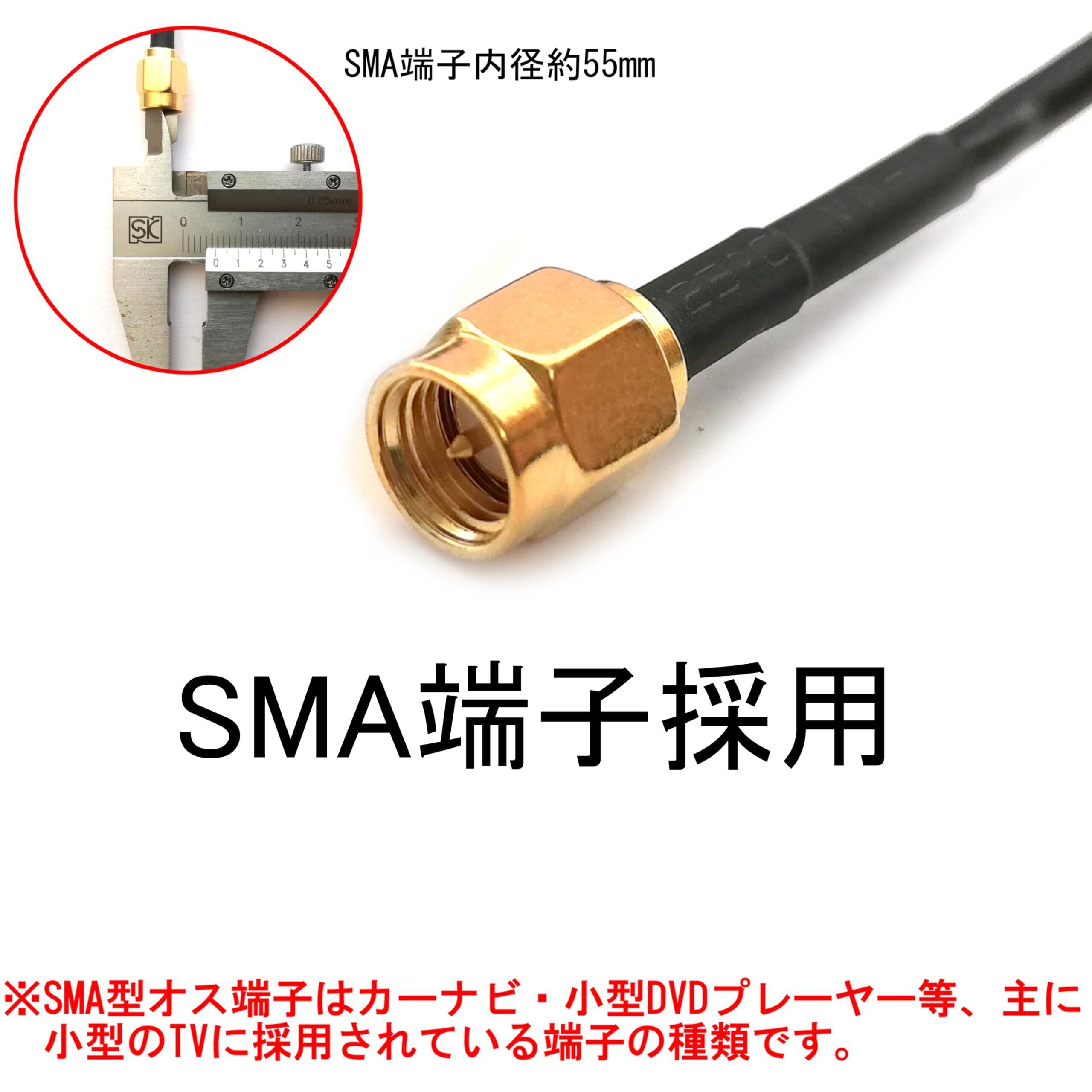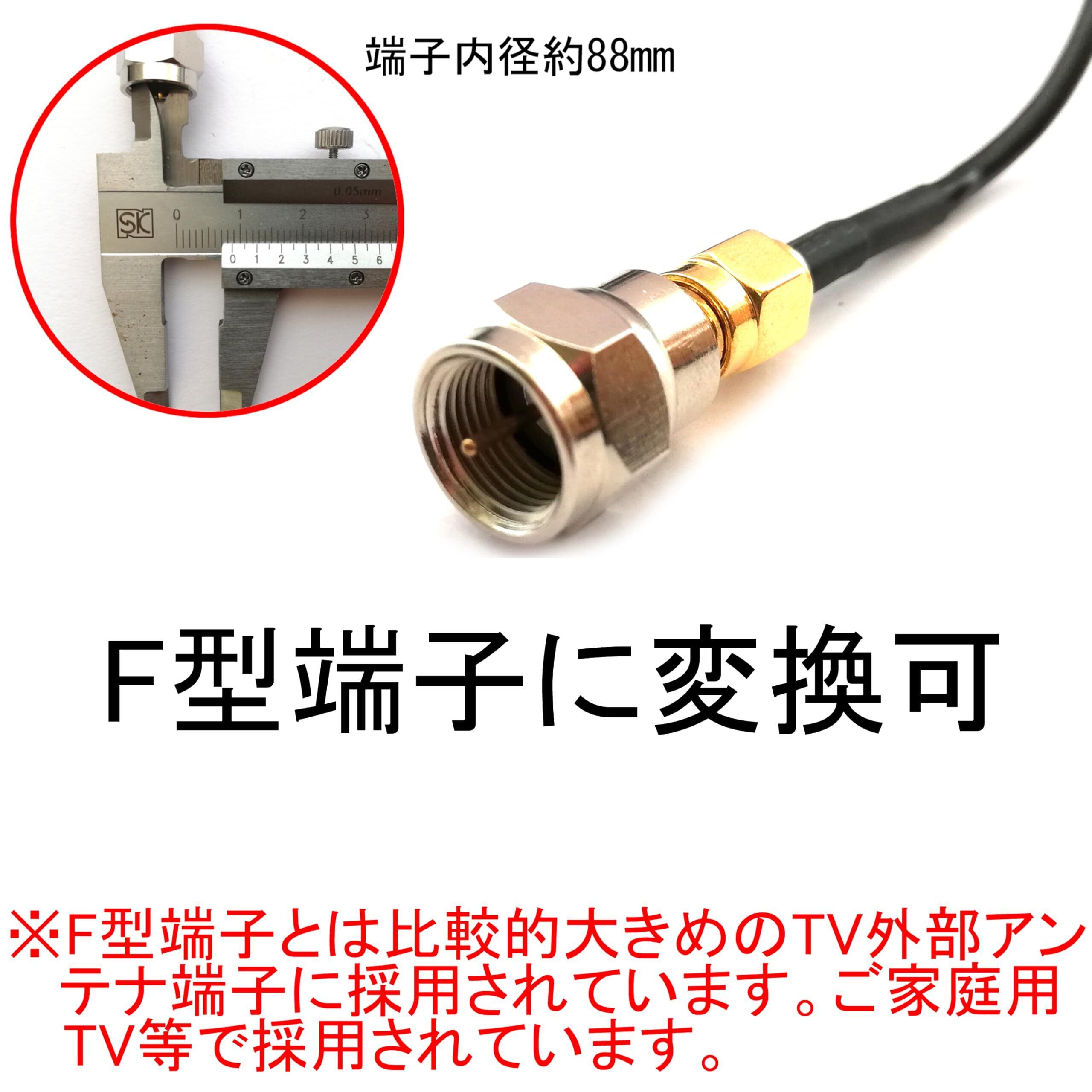 一般的な今主流のウィンドウフイルムアンテナと比較すると約2倍以上の電波の受信が改善されるので、ワンセグ・フルセグ自動切換えタイプのTVだとより良い画質のフルセグでの受信時間が長くなります。端子は一般家庭用TVの端子で採用されているF型オス端子採用。車載用TVや小型TV用として開発されたSMA端子をはじめ、MCX端子にも付属の変換端子の組み合わせで対応可能。SMA端子はご家庭用TVのアンテナ端子として採用されているF型端子と形状が似ていますが、2廻り程小型化された端子です。(家庭でご使用の場合は、大方屋根に設置してある八木式アンテナ(魚の骨のようなアンテナ)の方が受信は安定します。八木式アンテナは1方向の電波塔に向いている方角からの電波しか受信できませんが、受信性能は最強です。)